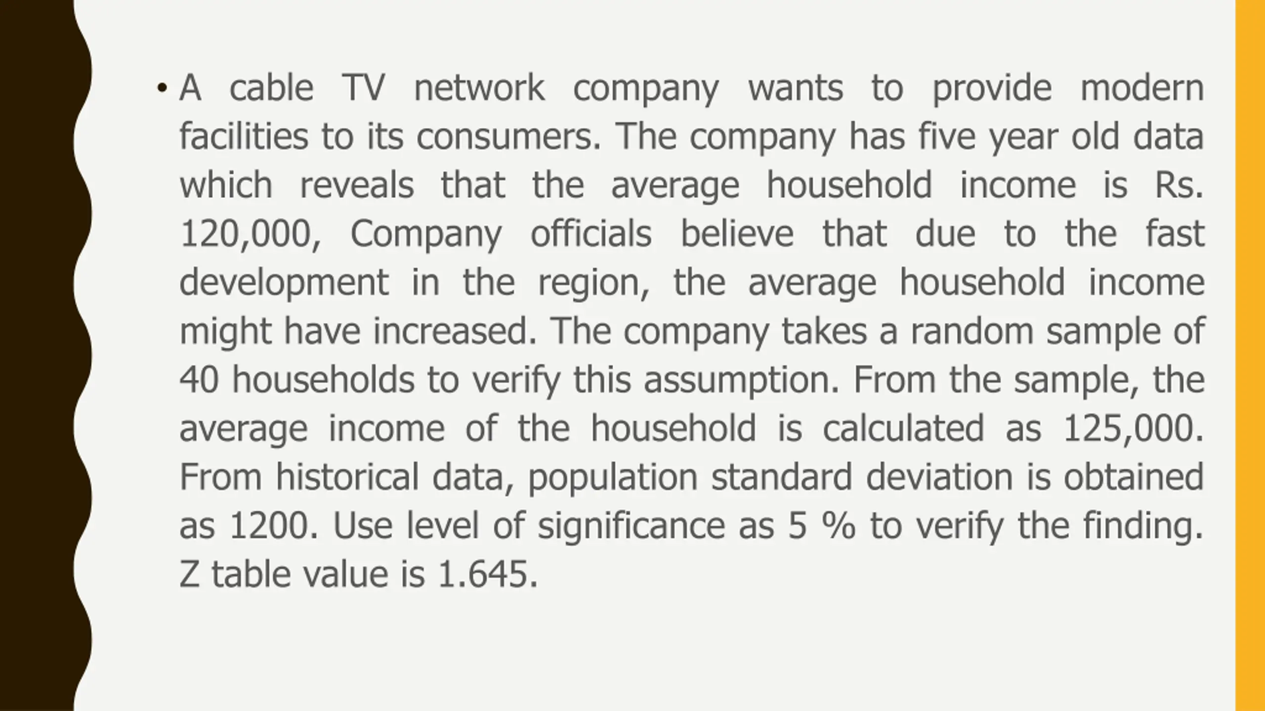 A cable TV network company wants to provide modern facilities to its consumers. The company has five year old data which reveals that the average household income is Rs. 120,000, Company officials believe that due to the fast development in the region, the average household income might have increased. The company takes a random sample of 40 households to verify this assumption. From the sample, the average income of the household is calculated as 125,000. From historical data, population standard deviation is obtained as 1200. Use level of significance as 5 % to verify the finding. Z table value is 1.645.