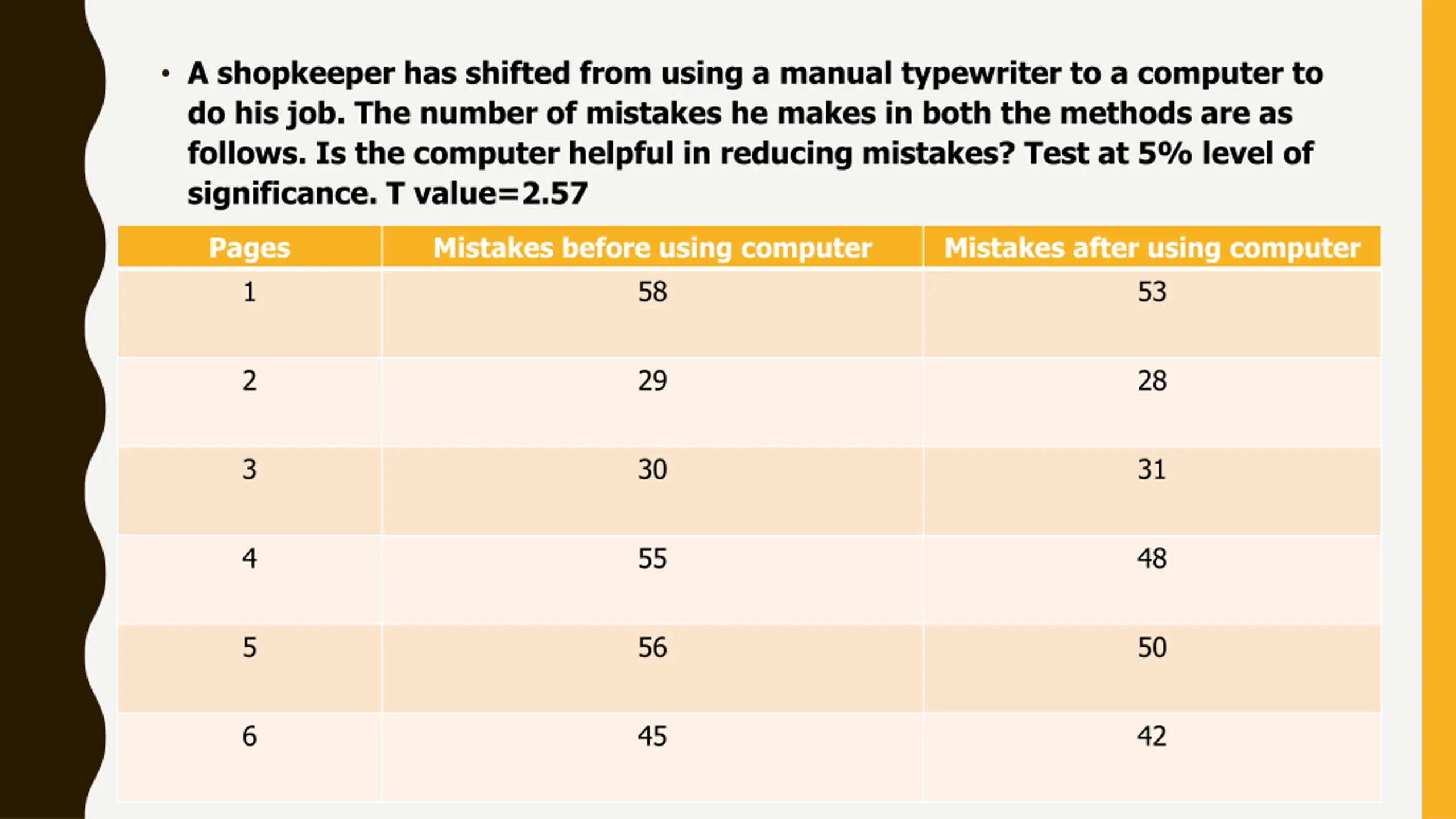 A shopkeeper has shifted from using a manual typewriter to a computer to do his job. The number of mistakes he makes in both the methods are as follows. Is the computer helpful in reducing mistakes? Test at 5% level of significance. T value=2.57 Pages 1 Mistakes before using computer 58 Mistakes after using computer 53 2 29 28 3 30 31 4 55 48 5 56 50 6 45 42