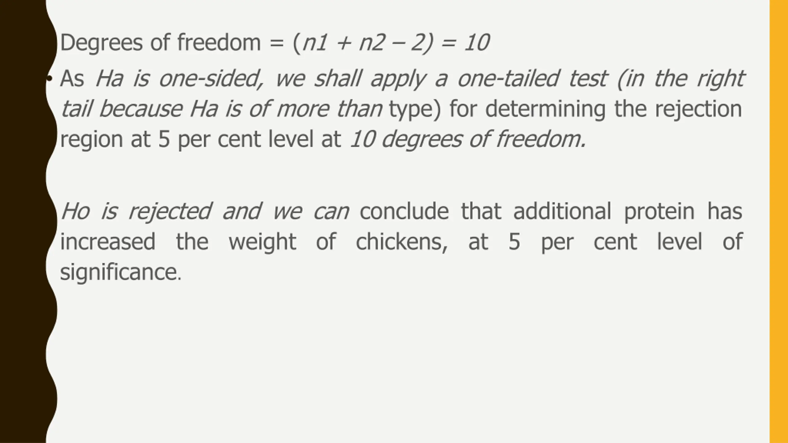 Degrees of freedom = (n1 + n2 2) = 10 As Ha is one-sided, we shall apply a one-tailed test (in the right tail because Ha is of more than type) for determining the rejection region at 5 per cent level at 10 degrees of freedom. Ho is rejected and we can conclude that additional protein has increased the weight of chickens, at 5 per cent level of significance.
