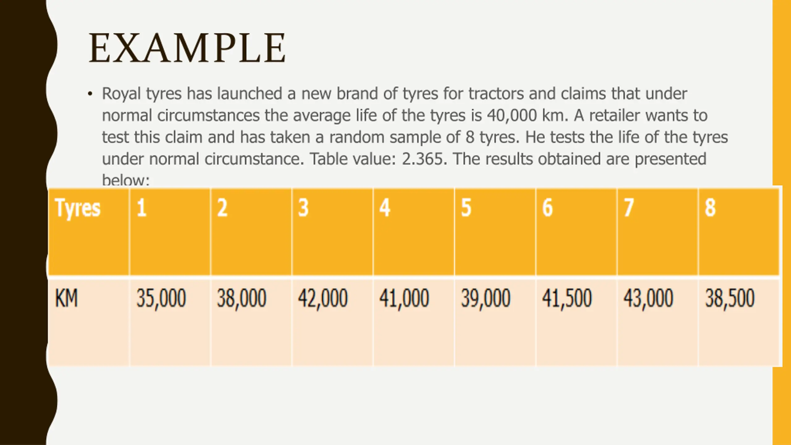 EXAMPLE Royal tyres has launched a new brand of tyres for tractors and claims that under normal circumstances the average life of the tyres is 40,000 km. A retailer wants to test this claim and has taken a random sample of 8 tyres. He tests the life of the tyres under normal circumstance. Table value: 2.365. The results obtained are presented below: