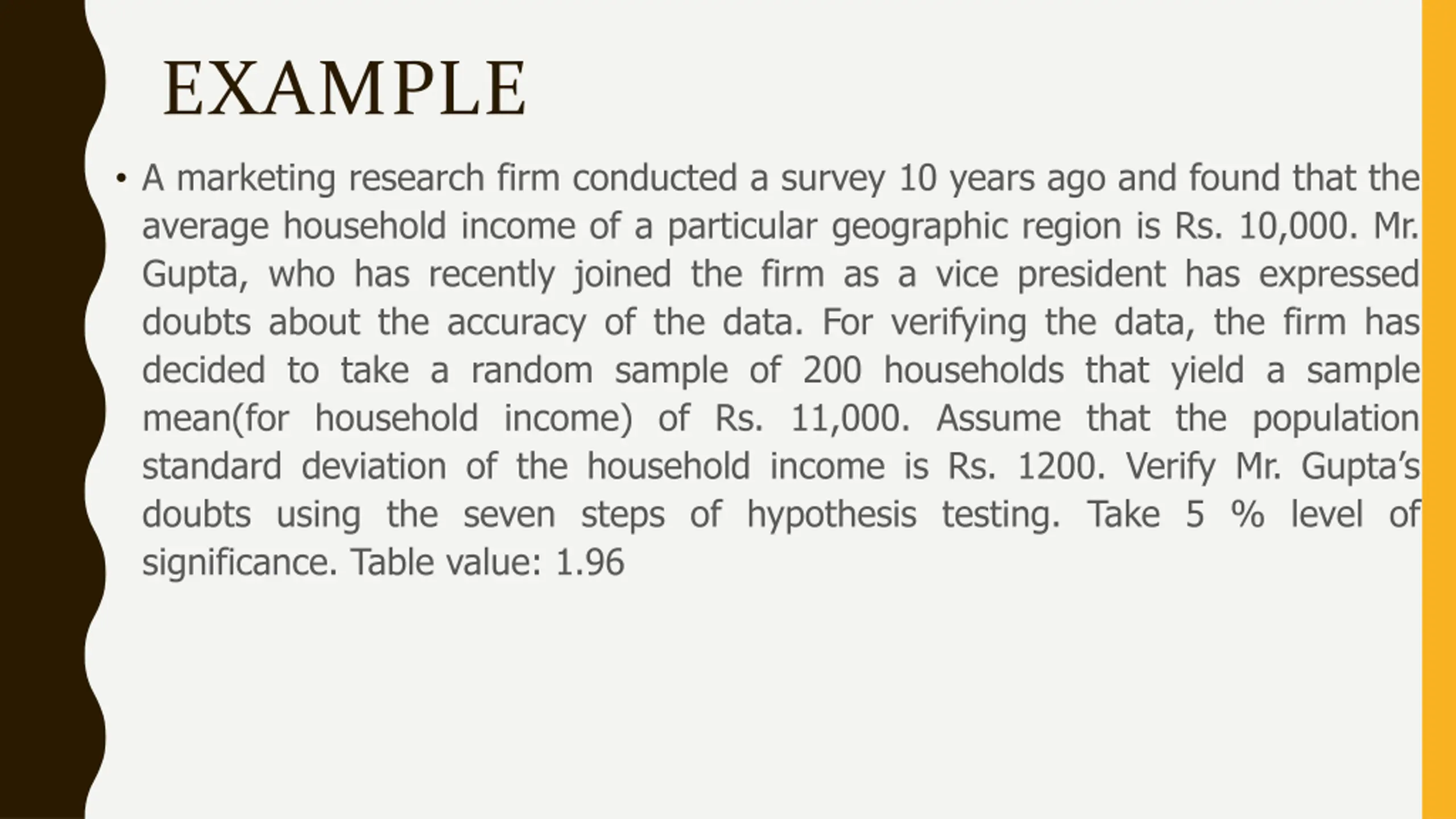 EXAMPLE A marketing research firm conducted a survey 10 years ago and found that the average household income of a particular geographic region is Rs. 10,000. Mr. Gupta, who has recently joined the firm as a vice president has expressed doubts about the accuracy of the data. For verifying the data, the firm has decided to take a random sample of 200 households that yield a sample mean(for household income) of Rs. 11,000. Assume that the population standard deviation of the household income is Rs. 1200. Verify Mr. Gupta s doubts using the seven steps of hypothesis testing. Take 5 % level of significance. Table value: 1.96