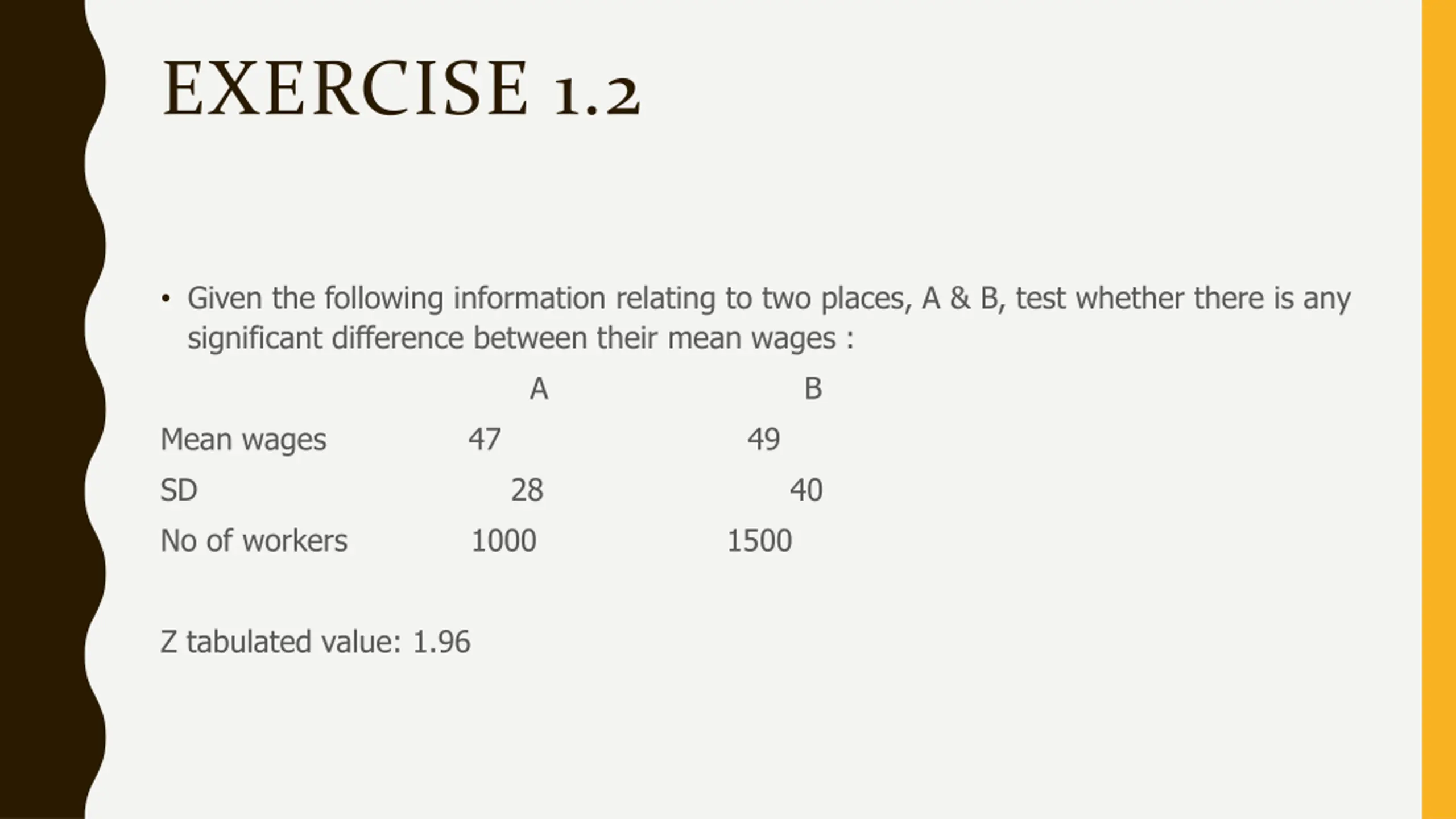 EXERCISE 1.2 Given the following information relating to two places, A & B, test whether there is any significant difference between their mean wages : A B Mean wages 47 49 SD 28 40 No of workers 1000 1500 Z tabulated value: 1.96