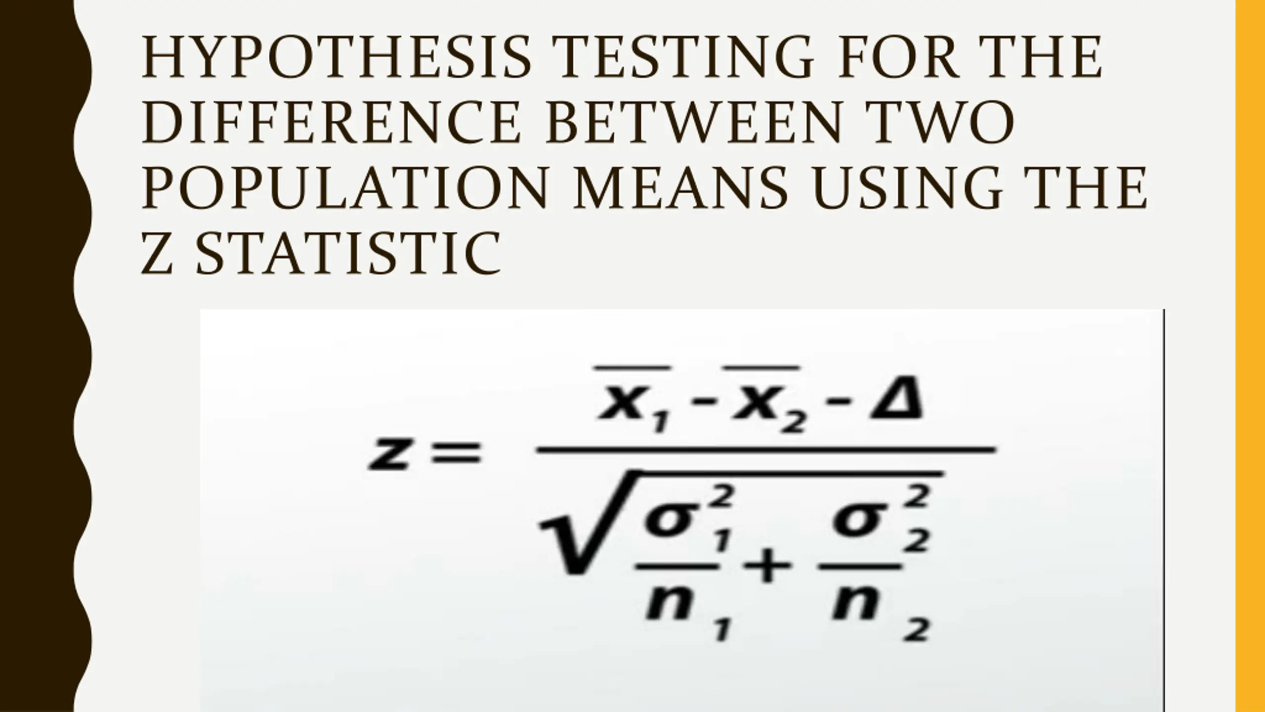 HYPOTHESIS TESTING FOR THE DIFFERENCE BETWEEN TWO POPULATION MEANS USING THE Z STATISTIC