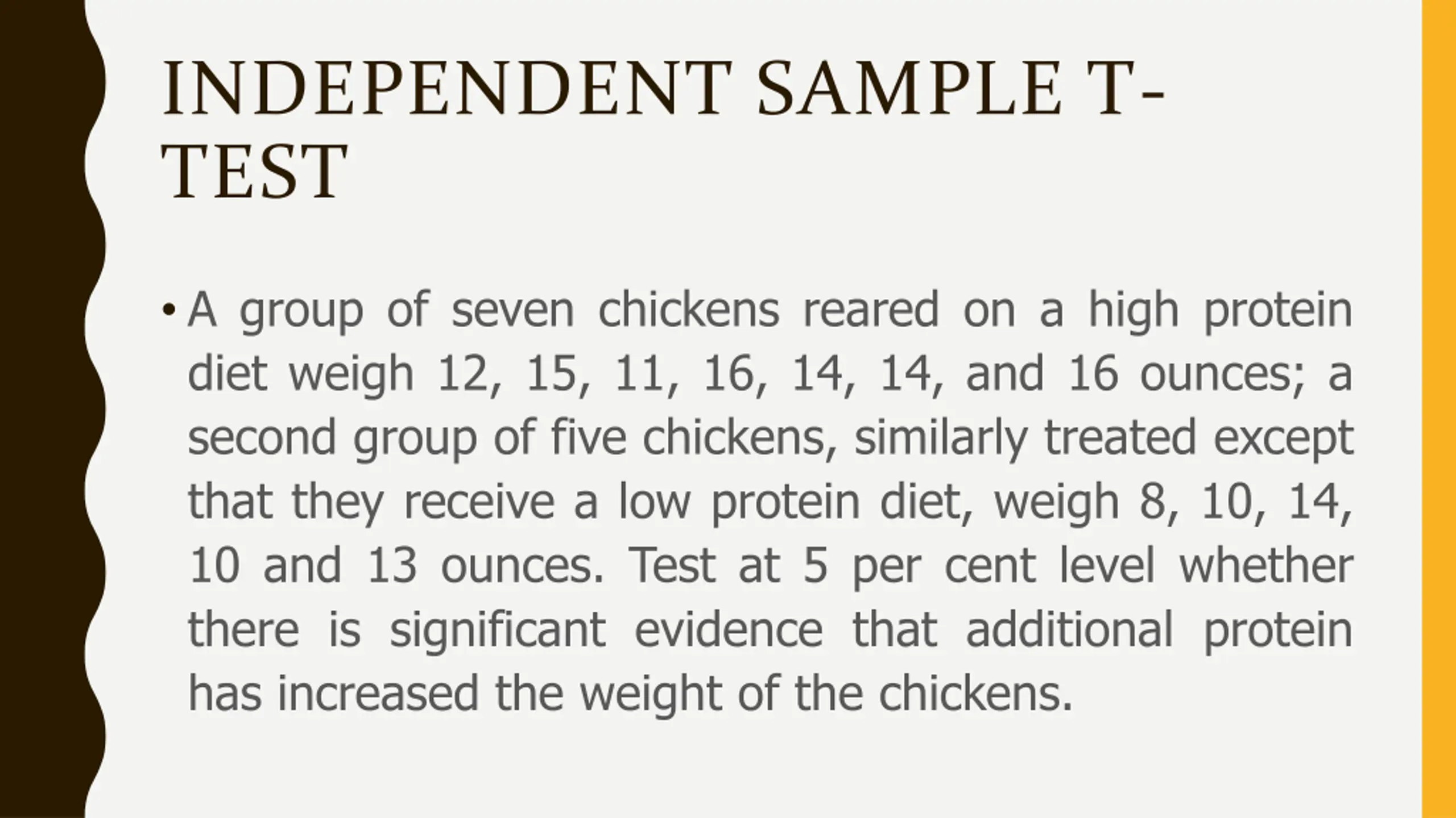 INDEPENDENT SAMPLE T- TEST A group of seven chickens reared on a high protein diet weigh 12, 15, 11, 16, 14, 14, and 16 ounces; a second group of five chickens, similarly treated except that they receive a low protein diet, weigh 8, 10, 14, 10 and 13 ounces. Test at 5 per cent level whether there is significant evidence that additional protein has increased the weight of the chickens.