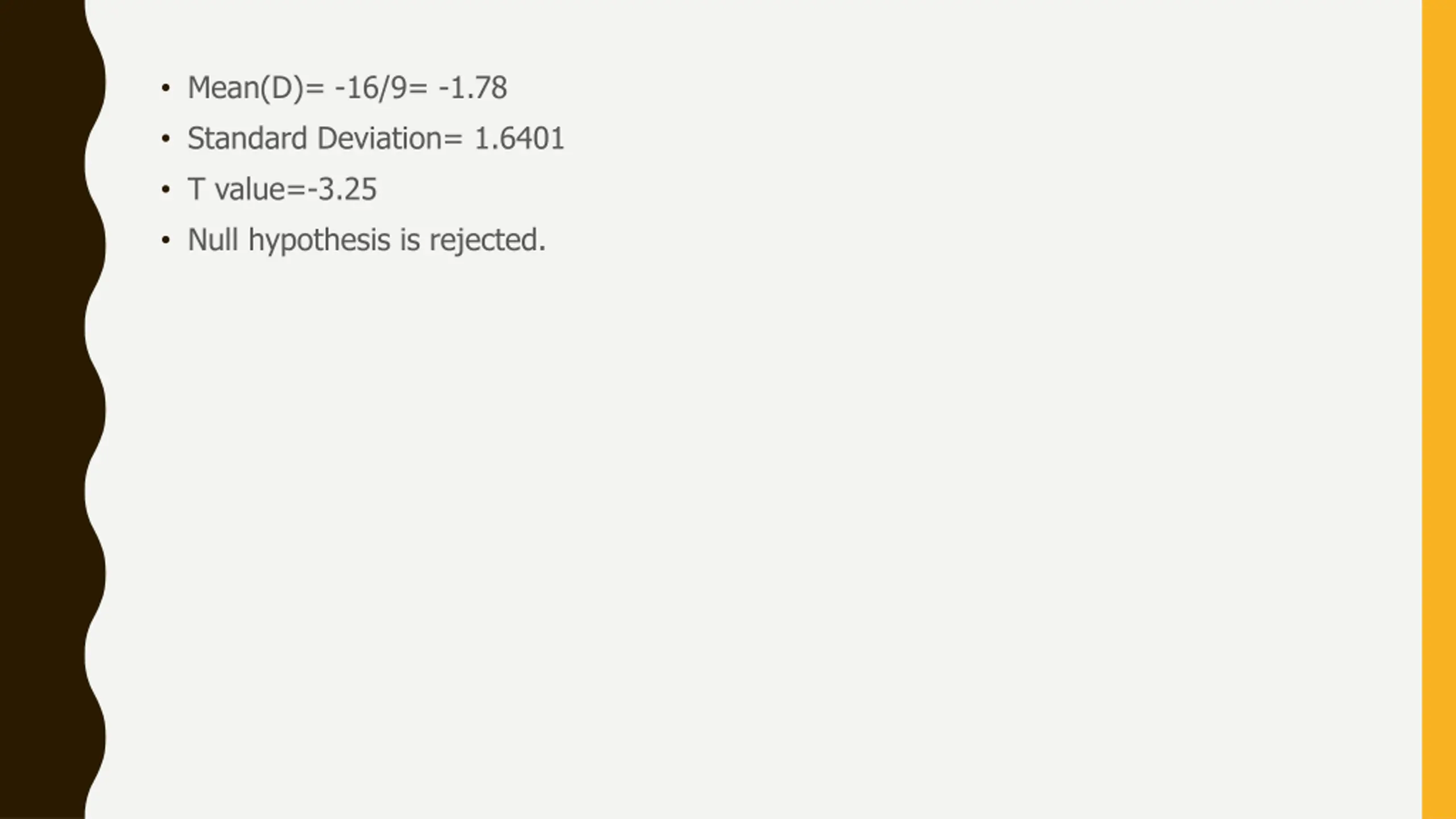 Mean(D)= -16/9= -1.78 Standard Deviation= 1.6401 T value=-3.25 Null hypothesis is rejected.