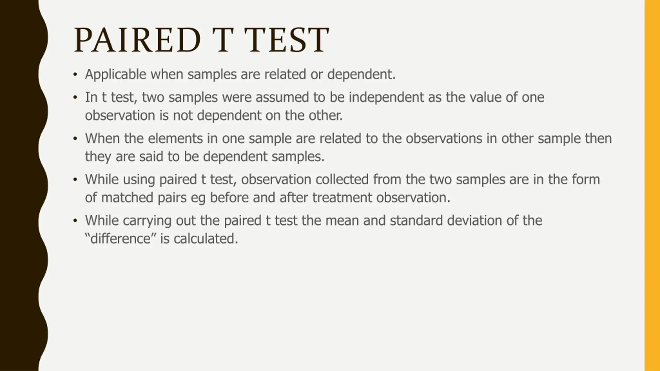 PAIRED T TEST Applicable when samples are related or dependent. In t test, two samples were assumed to be independent as the value of one observation is not dependent on the other. When the elements in one sample are related to the observations in other sample then they are said to be dependent samples. While using paired t test, observation collected from the two samples are in the form of matched pairs eg before and after treatment observation. While carrying out the paired t test the mean and standard deviation of the difference is calculated.