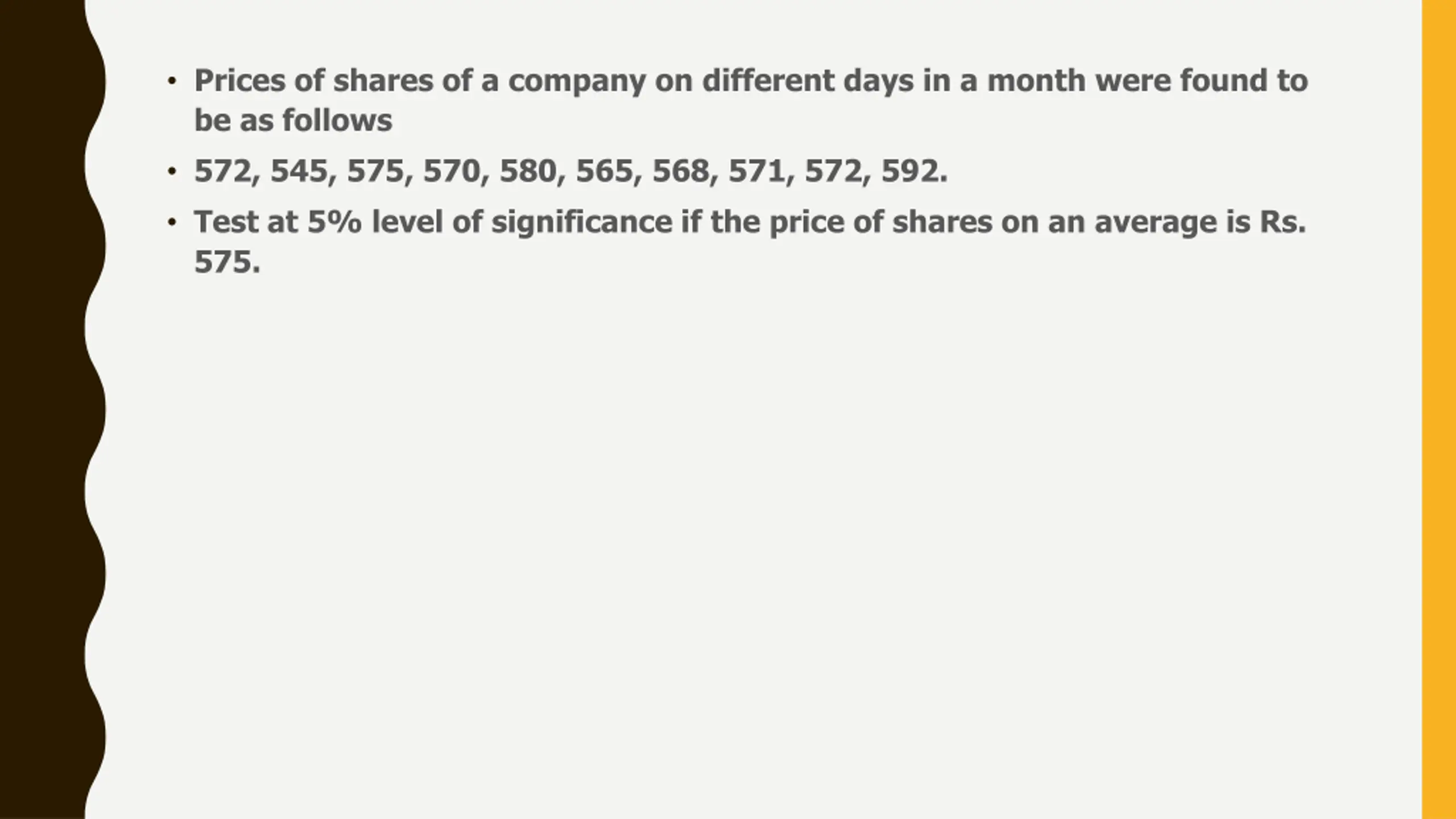 Prices of shares of a company on different days in a month were found to be as follows 572, 545, 575, 570, 580, 565, 568, 571, 572, 592. Test at 5% level of significance if the price of shares on an average is Rs. 575.