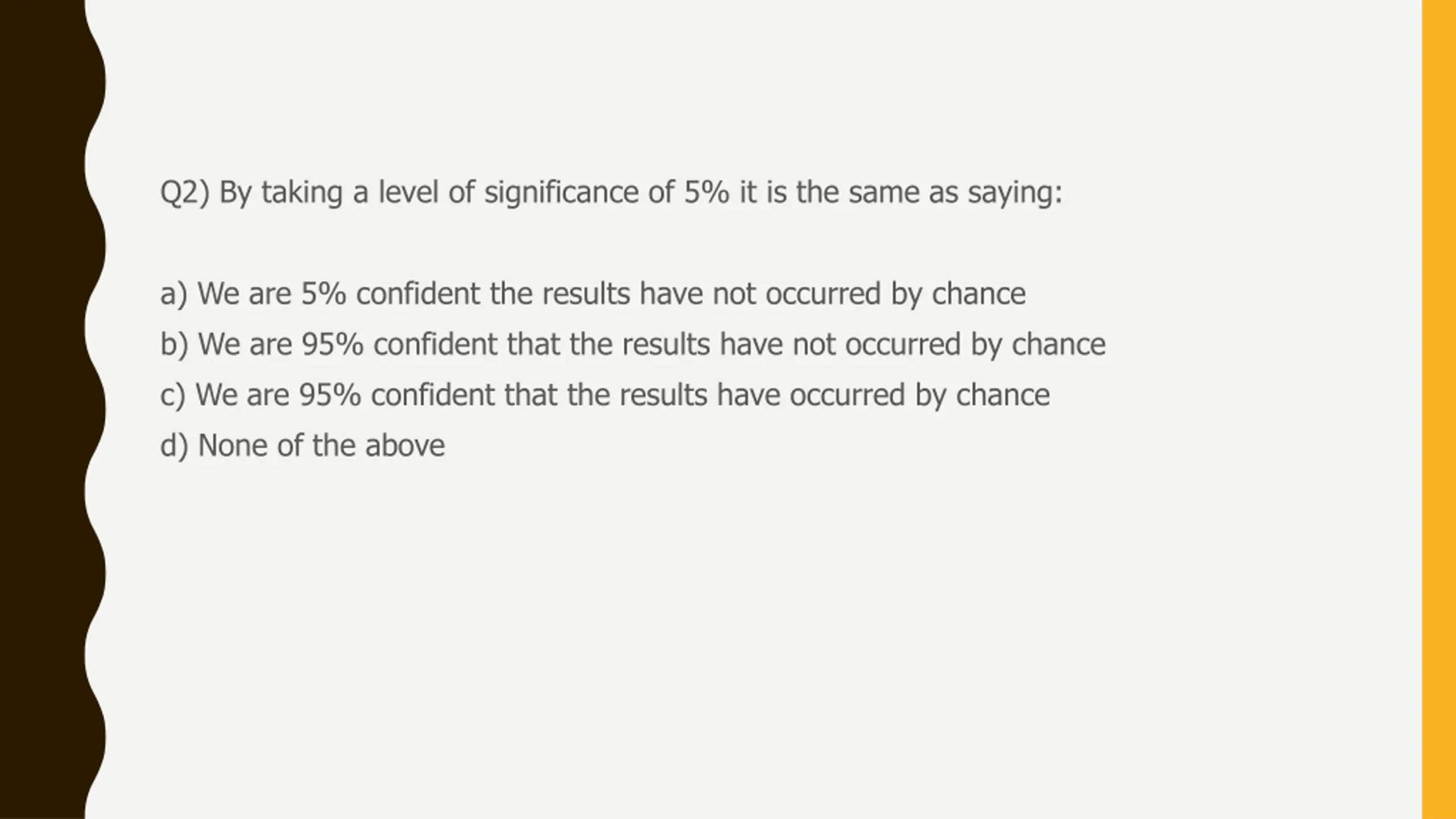 Q2) By taking a level of significance of 5% it is the same as saying: a) We are 5% confident the results have not occurred by chance b) We are 95% confident that the results have not occurred by chance c) We are 95% confident that the results have occurred by chance d) None of the above