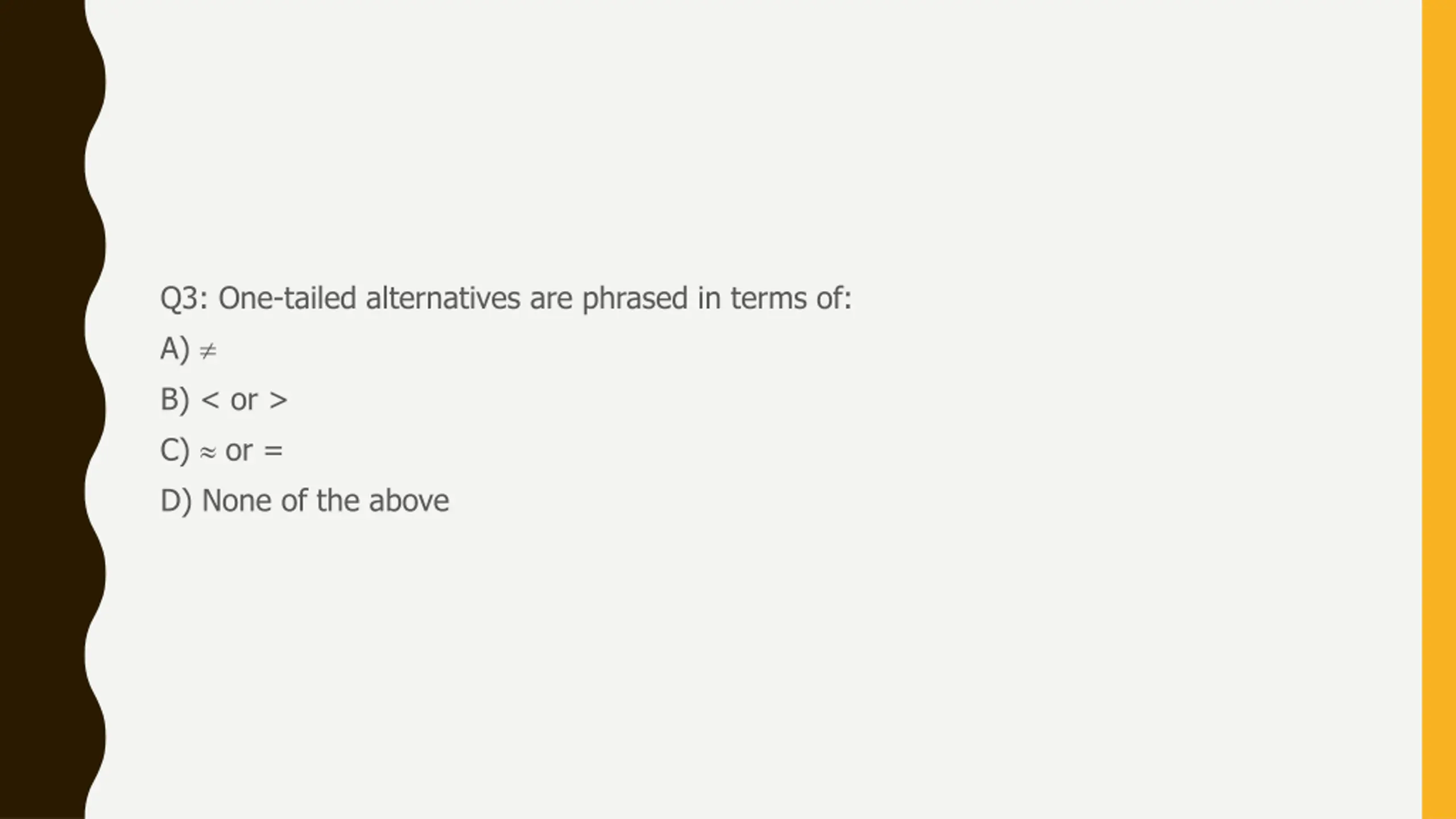 Q3: One-tailed alternatives are phrased in terms of: A) B) < or > C) or = D) None of the above