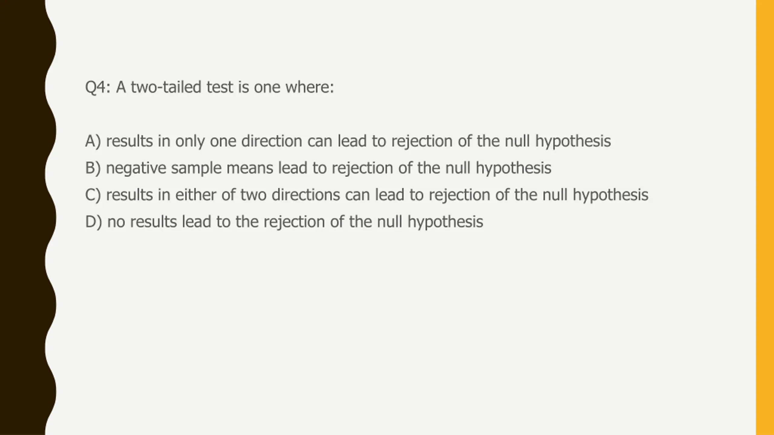 Q4: A two-tailed test is one where: A) results in only one direction can lead to rejection of the null hypothesis B) negative sample means lead to rejection of the null hypothesis C) results in either of two directions can lead to rejection of the null hypothesis D) no results lead to the rejection of the null hypothesis