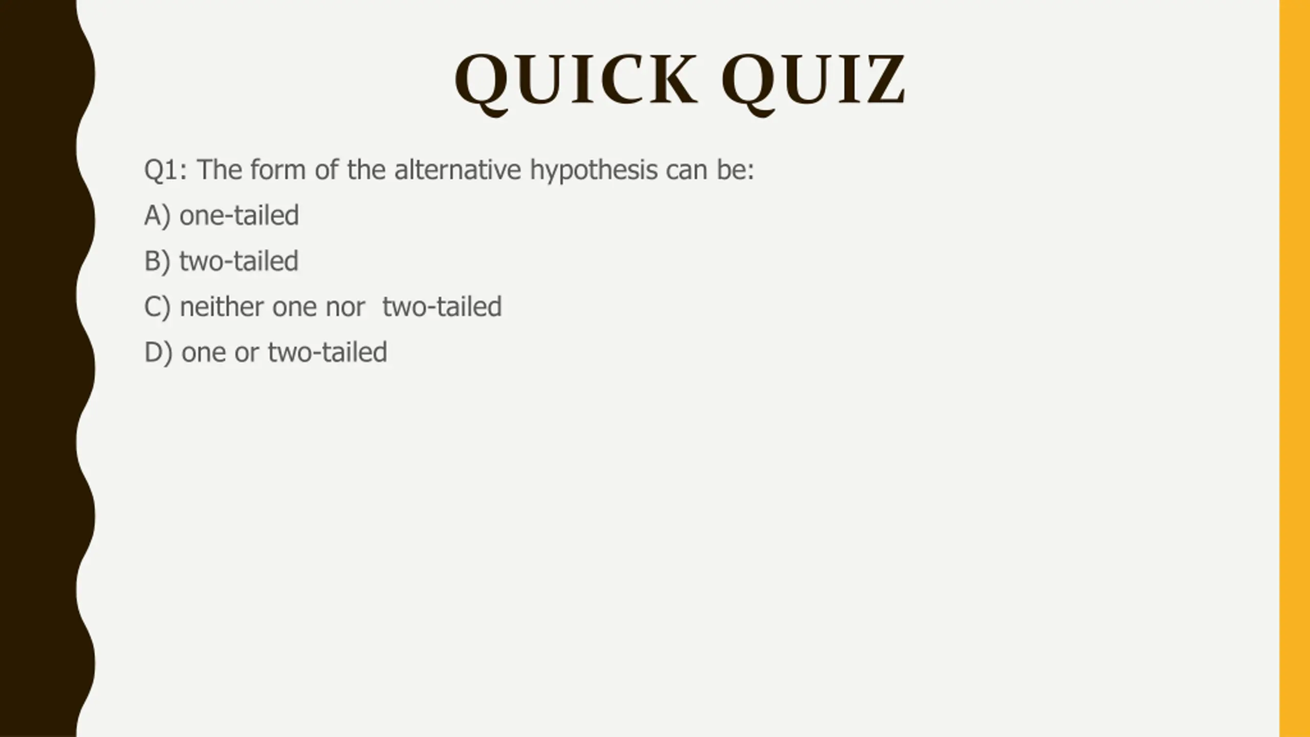 QUICK QUIZ Q1: The form of the alternative hypothesis can be: A) one-tailed B) two-tailed C) neither one nor two-tailed D) one or two-tailed