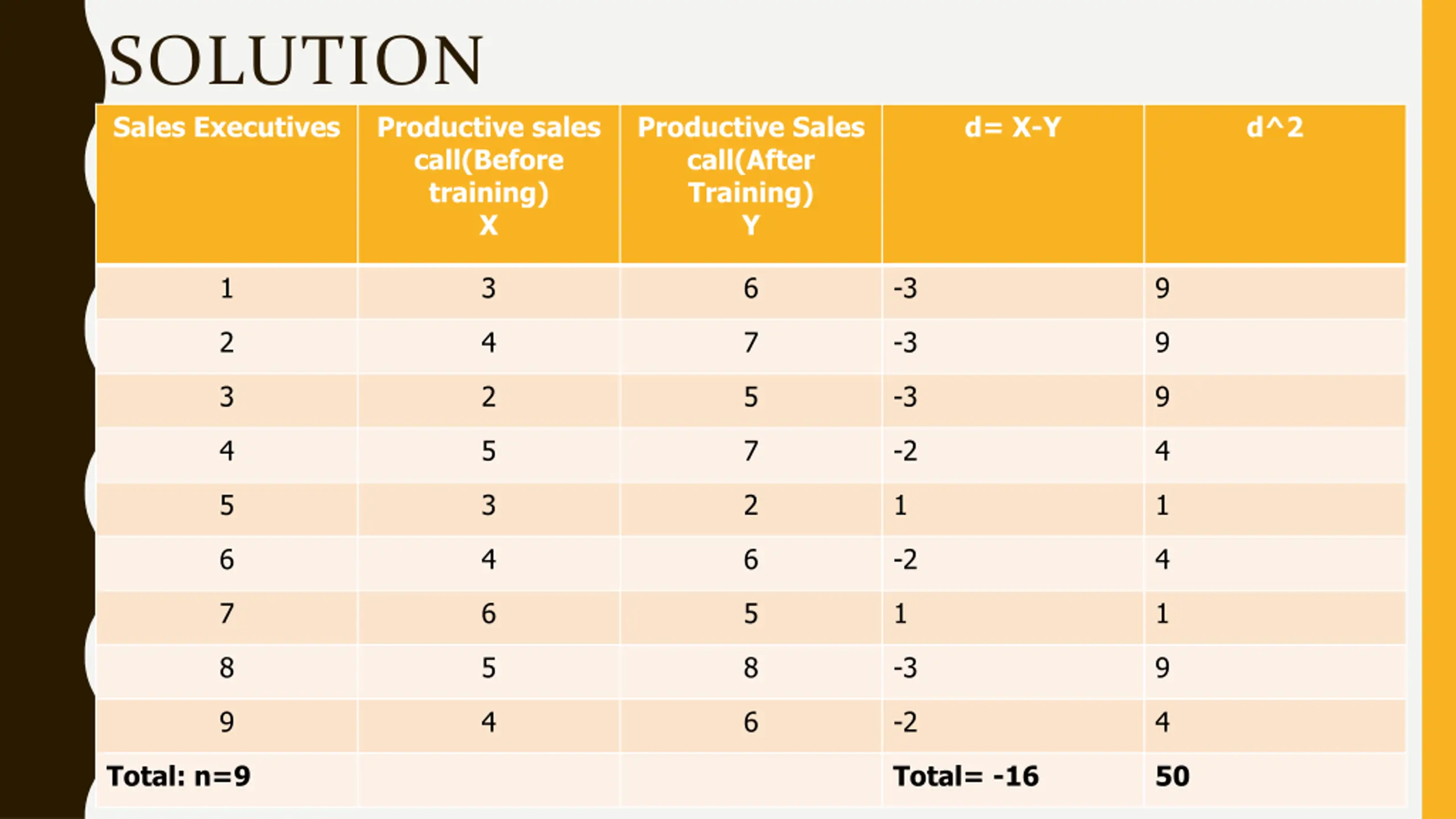 SOLUTION Sales Executives Productive sales call(Before training) X Productive Sales call(After Training) Y d= X-Y d^2 1 3 6 -3 9 2 4 7 -3 9 3 2 5 -3 9 4 5 7 -2 4 5 3 2 1 1 6 4 6 -2 4 7 6 5 1 1 8 5 8 -3 9 9 4 6 -2 4 Total: n=9 Total= -16 50