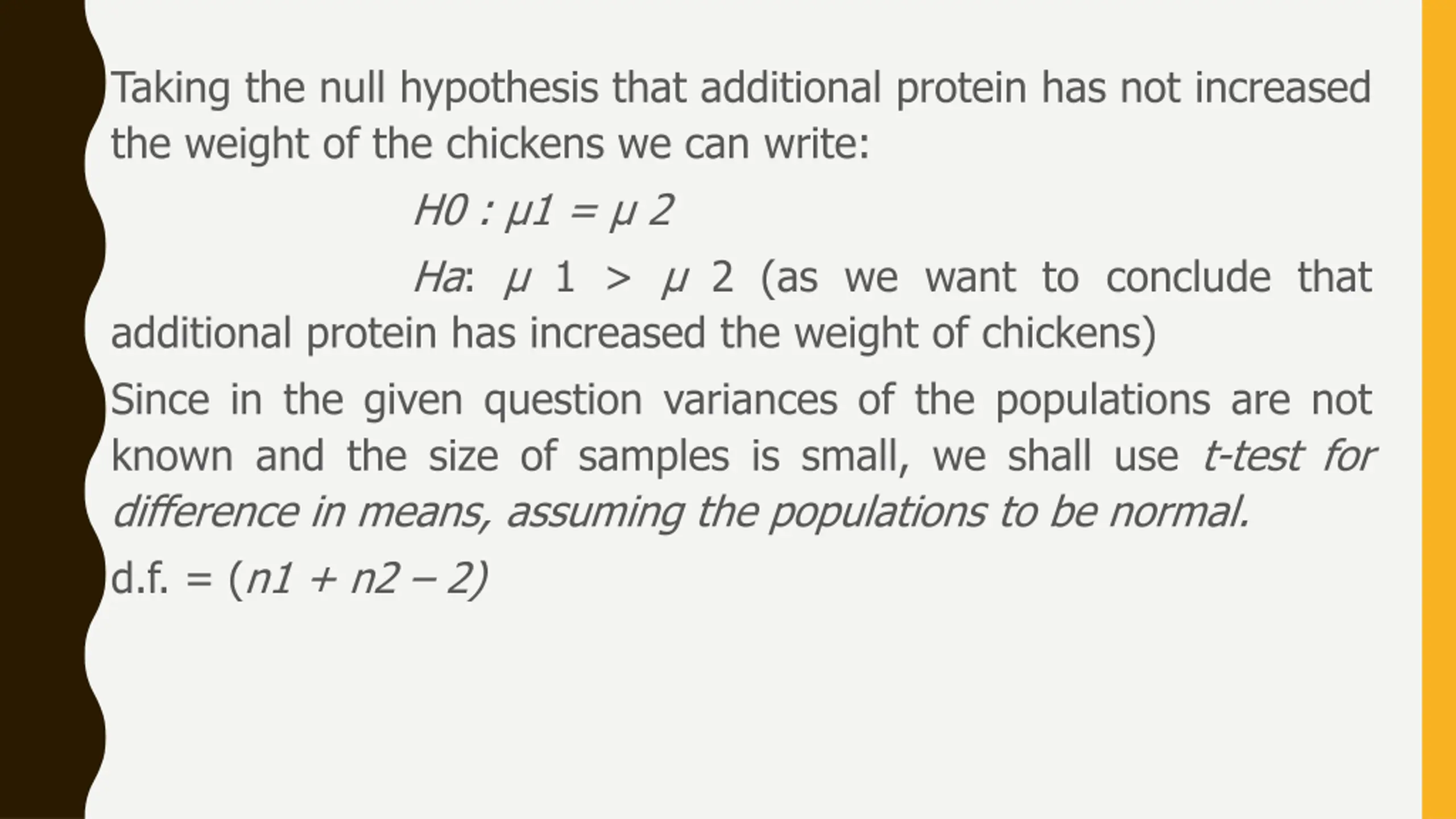 Taking the null hypothesis that additional protein has not increased the weight of the chickens we can write: H0 : 1 = 2 Ha: 1 > 2 (as we want to conclude that additional protein has increased the weight of chickens) Since in the given question variances of the populations are not known and the size of samples is small, we shall use t-test for difference in means, assuming the populations to be normal. d.f. = (n1 + n2 2)
