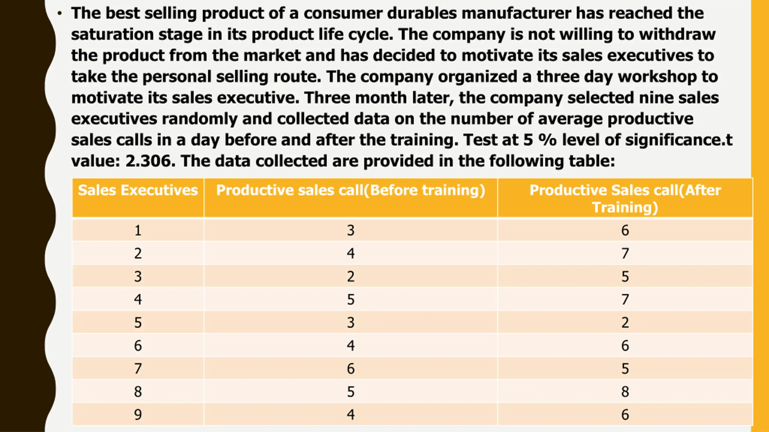 The best selling product of a consumer durables manufacturer has reached the saturation stage in its product life cycle. The company is not willing to withdraw the product from the market and has decided to motivate its sales executives to take the personal selling route. The company organized a three day workshop to motivate its sales executive. Three month later, the company selected nine sales executives randomly and collected data on the number of average productive sales calls in a day before and after the training. Test at 5 % level of significance.t value: 2.306. The data collected are provided in the following table: Sales Executives Productive sales call(Before training) Productive Sales call(After Training) 6 7 5 7 2 6 5 8 6 1 2 3 4 5 6 7 8 9 3 4 2 5 3 4 6 5 4