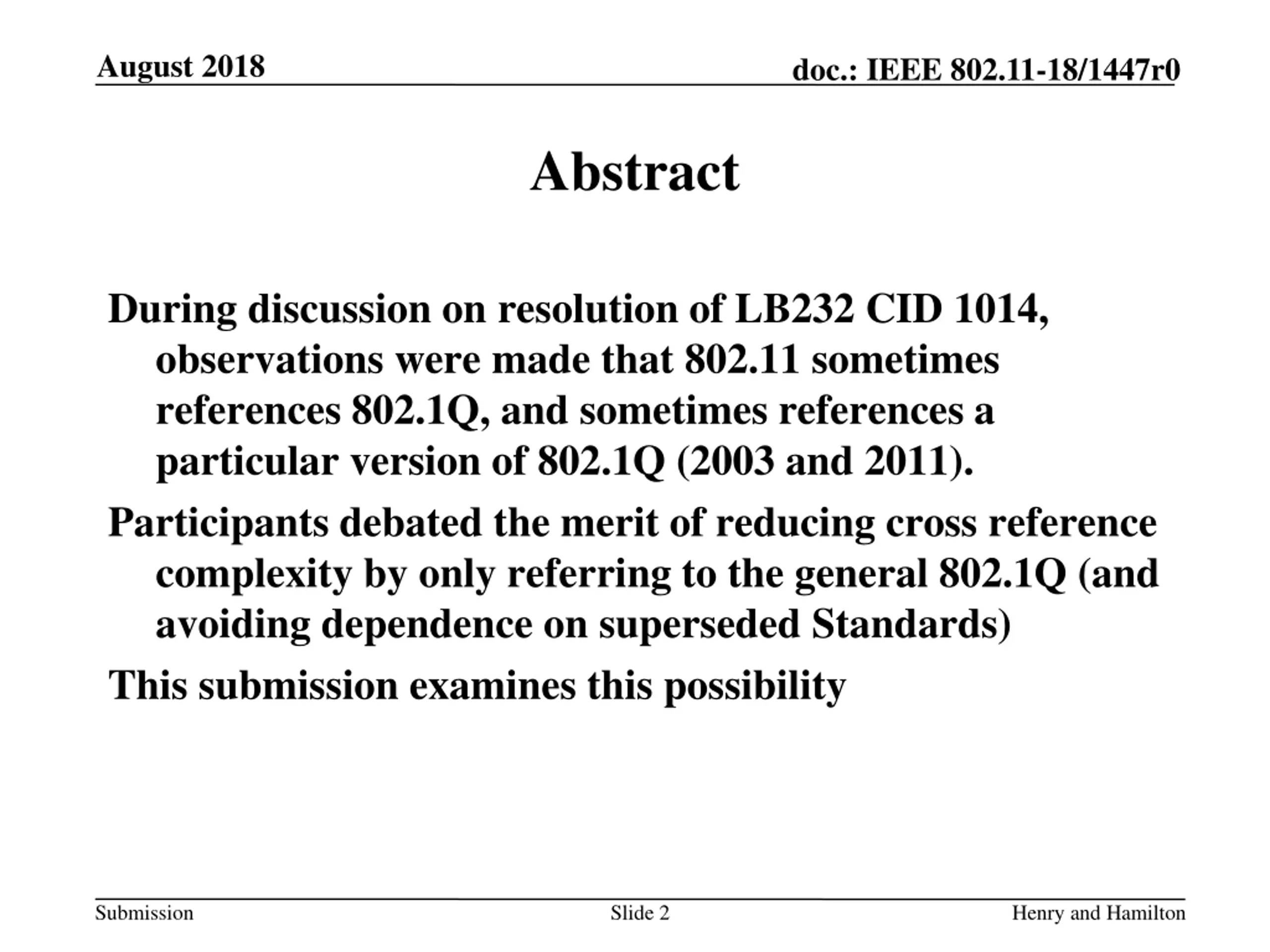 August 2018 doc.: IEEE 802.11-18/1447r0 Abstract During discussion on resolution of LB232 CID 1014, observations were made that 802.11 sometimes references 802.1Q, and sometimes references a particular version of 802.1Q (2003 and 2011). Participants debated the merit of reducing cross reference complexity by only referring to the general 802.1Q (and avoiding dependence on superseded Standards) This submission examines this possibility Submission Slide 2 Henry and Hamilton
