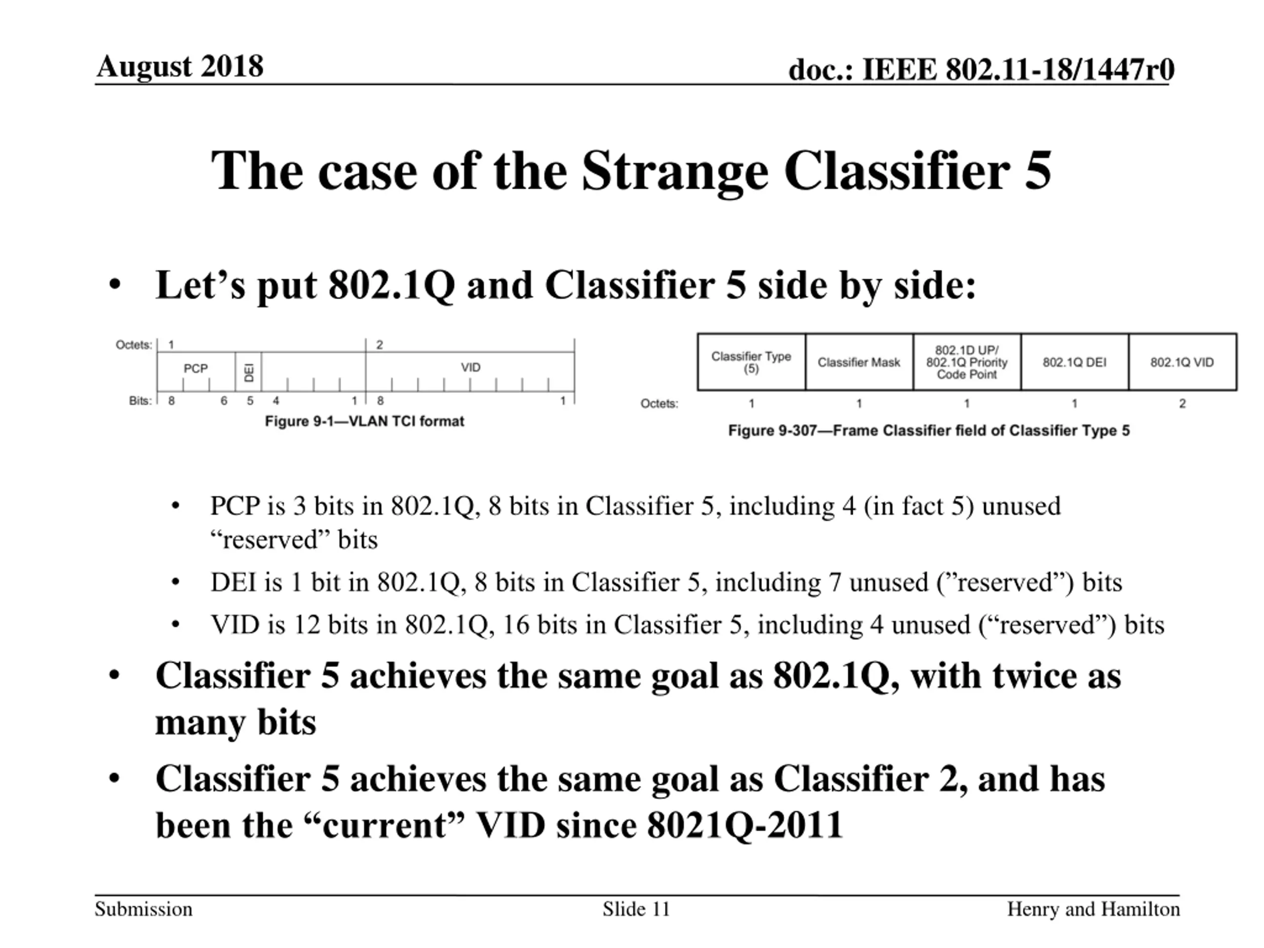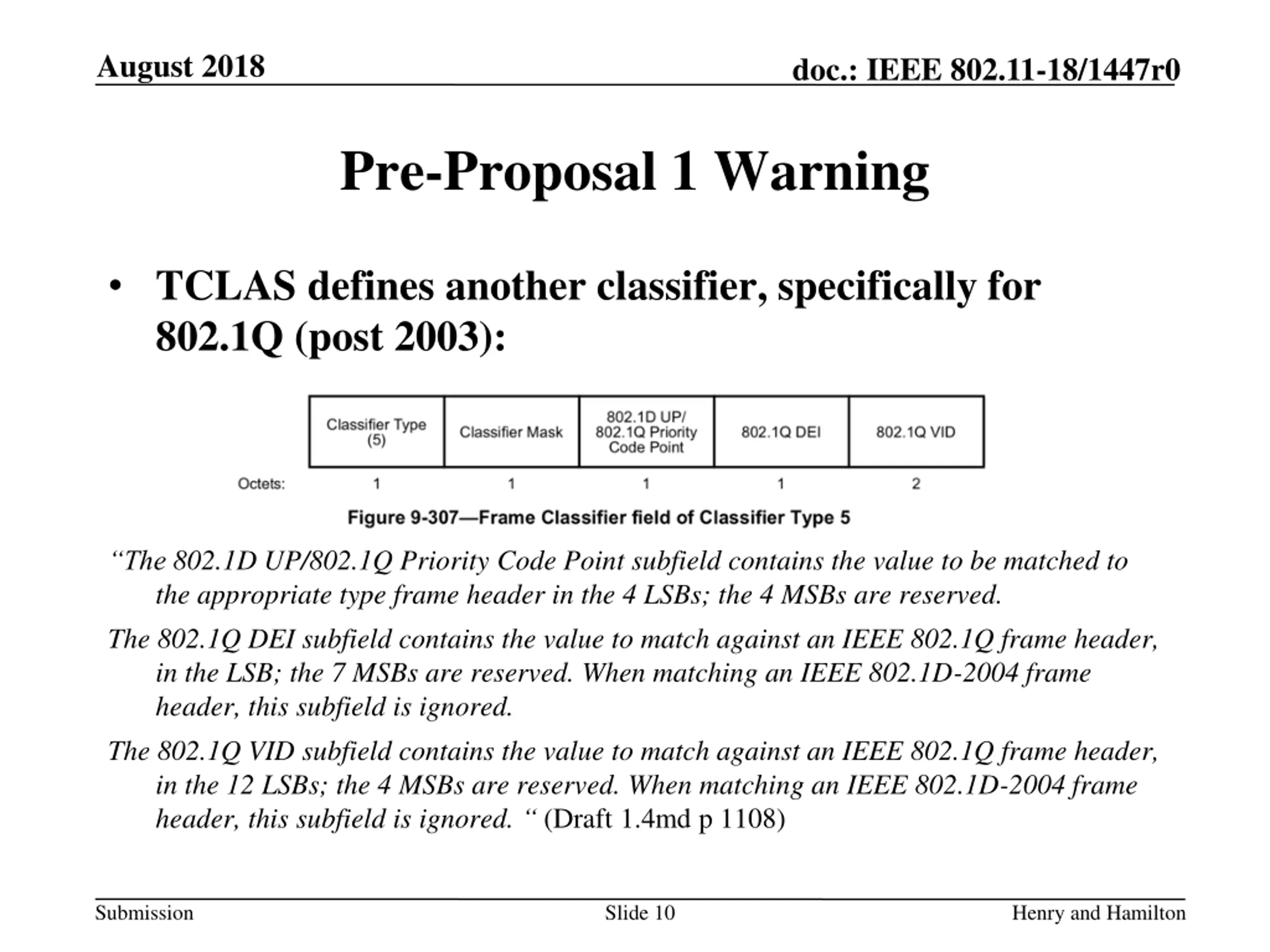 August 2018 doc.: IEEE 802.11-18/1447r0 Pre-Proposal 1 Warning TCLAS defines another classifier, specifically for 802.1Q (post 2003): The 802.1D UP/802.1Q Priority Code Point subfield contains the value to be matched to the appropriate type frame header in the 4 LSBs; the 4 MSBs are reserved. The 802.1Q DEI subfield contains the value to match against an IEEE 802.1Q frame header, in the LSB; the 7 MSBs are reserved. When matching an IEEE 802.1D-2004 frame header, this subfield is ignored. The 802.1Q VID subfield contains the value to match against an IEEE 802.1Q frame header, in the 12 LSBs; the 4 MSBs are reserved. When matching an IEEE 802.1D-2004 frame header, this subfield is ignored. (Draft 1.4md p 1108) Submission Slide 10 Henry and Hamilton