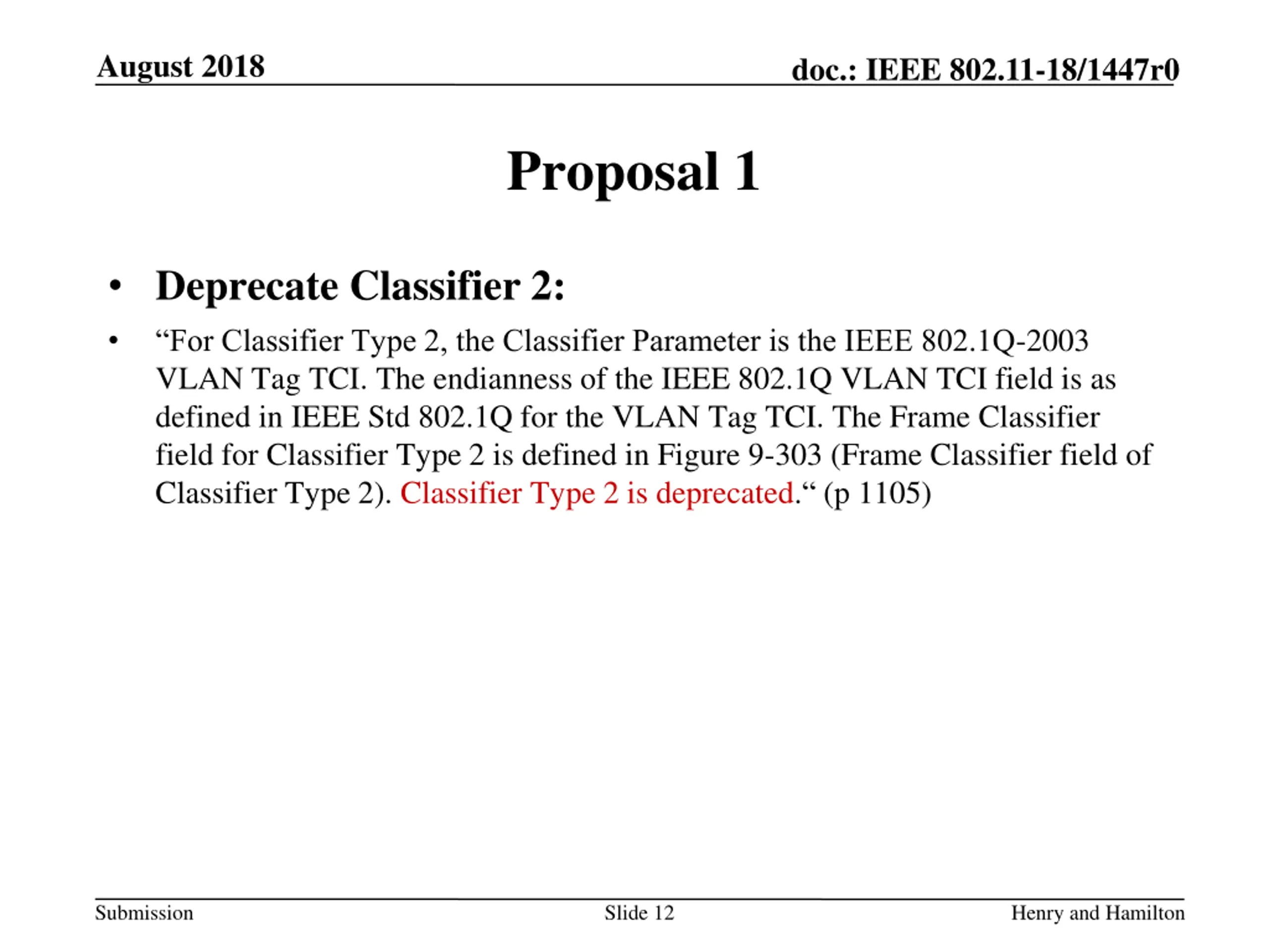 August 2018 doc.: IEEE 802.11-18/1447r0 Proposal 1 Deprecate Classifier 2: For Classifier Type 2, the Classifier Parameter is the IEEE 802.1Q-2003 VLAN Tag TCI. The endianness of the IEEE 802.1Q VLAN TCI field is as defined in IEEE Std 802.1Q for the VLAN Tag TCI. The Frame Classifier field for Classifier Type 2 is defined in Figure 9-303 (Frame Classifier field of Classifier Type 2). Classifier Type 2 is deprecated. (p 1105) Submission Slide 12 Henry and Hamilton