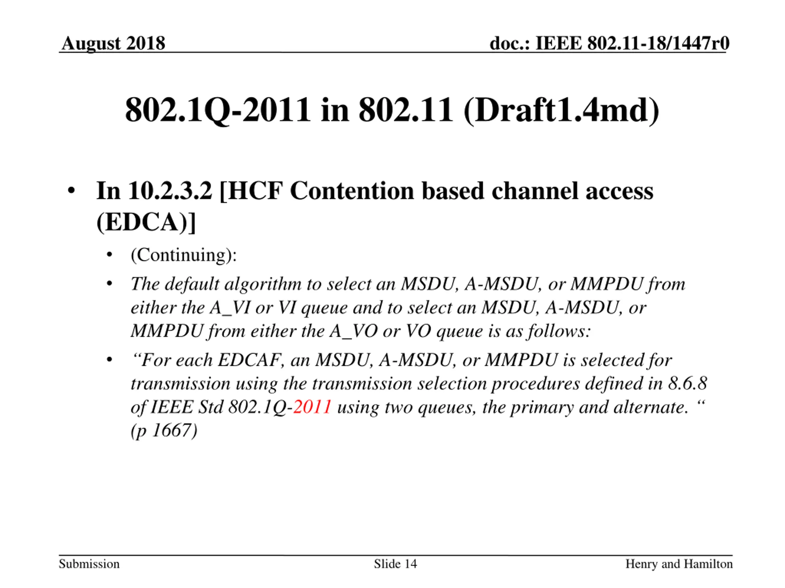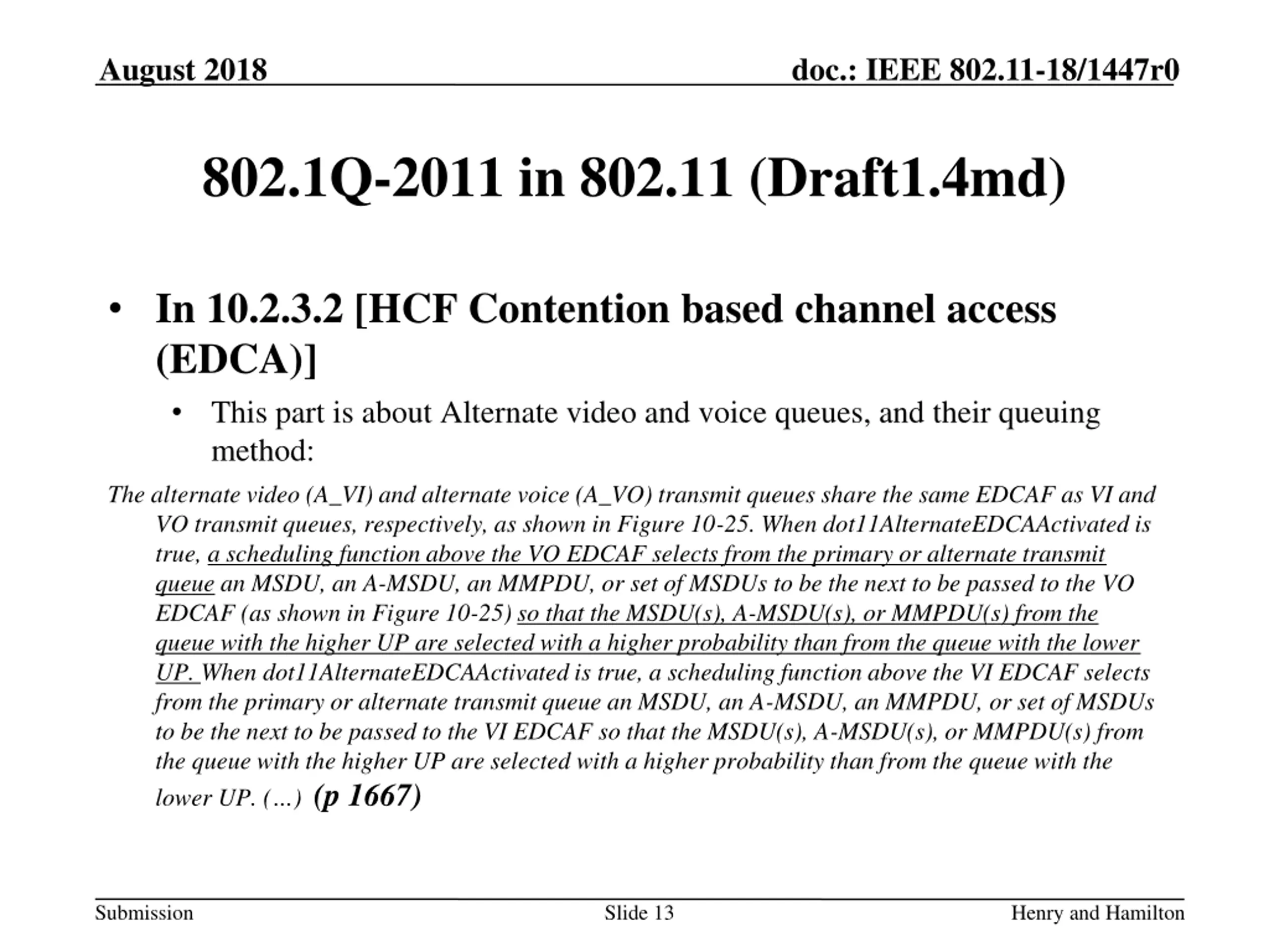 August 2018 doc.: IEEE 802.11-18/1447r0 802.1Q-2011 in 802.11 (Draft1.4md) In 10.2.3.2 [HCF Contention based channel access (EDCA)] This part is about Alternate video and voice queues, and their queuing method: The alternate video (A_VI) and alternate voice (A_VO) transmit queues share the same EDCAF as VI and VO transmit queues, respectively, as shown in Figure 10-25. When dot11AlternateEDCAActivated is true, a scheduling function above the VO EDCAF selects from the primary or alternate transmit queue an MSDU, an A-MSDU, an MMPDU, or set of MSDUs to be the next to be passed to the VO EDCAF (as shown in Figure 10-25) so that the MSDU(s), A-MSDU(s), or MMPDU(s) from the queue with the higher UP are selected with a higher probability than from the queue with the lower UP. When dot11AlternateEDCAActivated is true, a scheduling function above the VI EDCAF selects from the primary or alternate transmit queue an MSDU, an A-MSDU, an MMPDU, or set of MSDUs to be the next to be passed to the VI EDCAF so that the MSDU(s), A-MSDU(s), or MMPDU(s) from the queue with the higher UP are selected with a higher probability than from the queue with the lower UP. ( ) (p 1667) Submission Slide 13 Henry and Hamilton