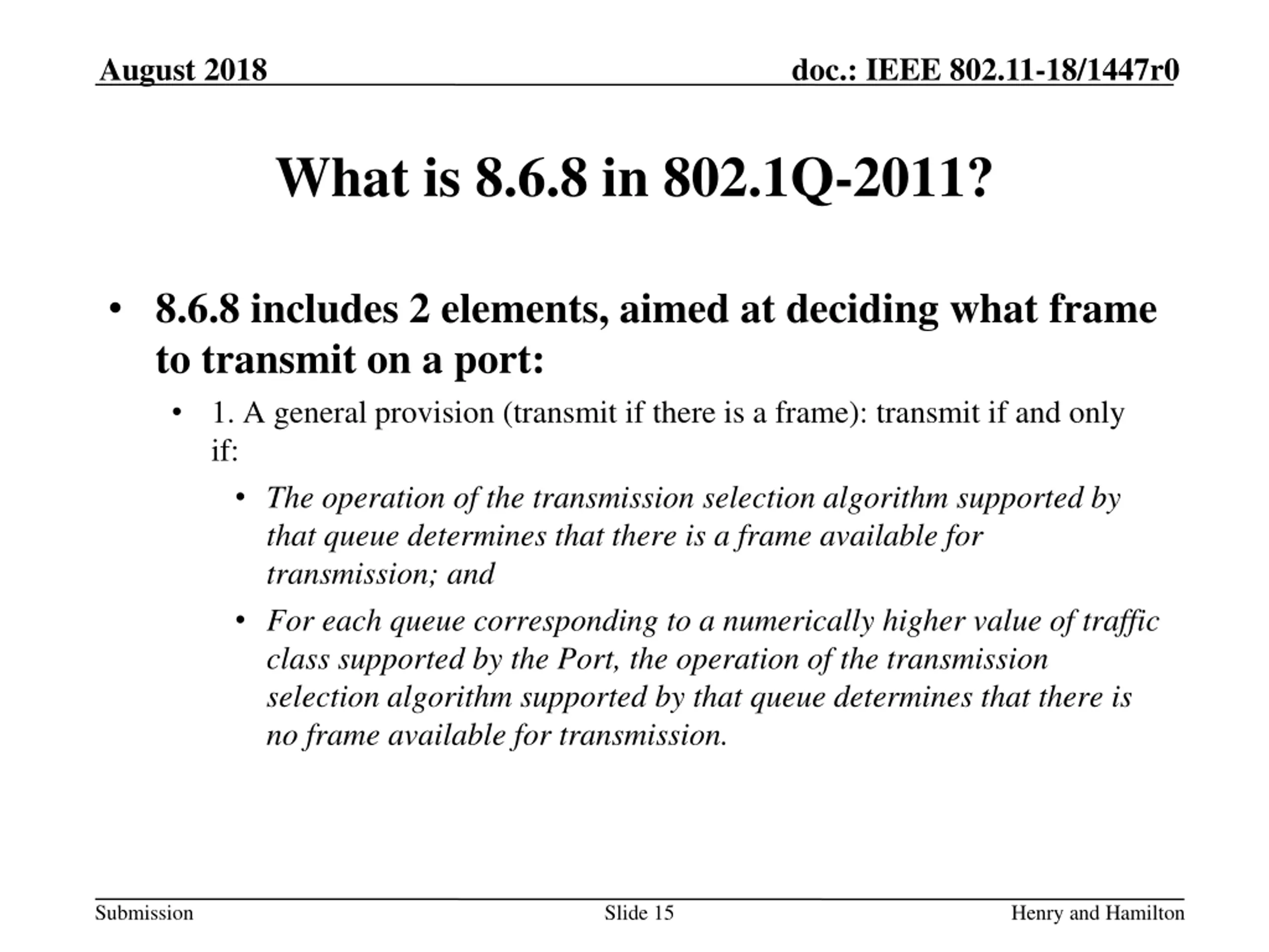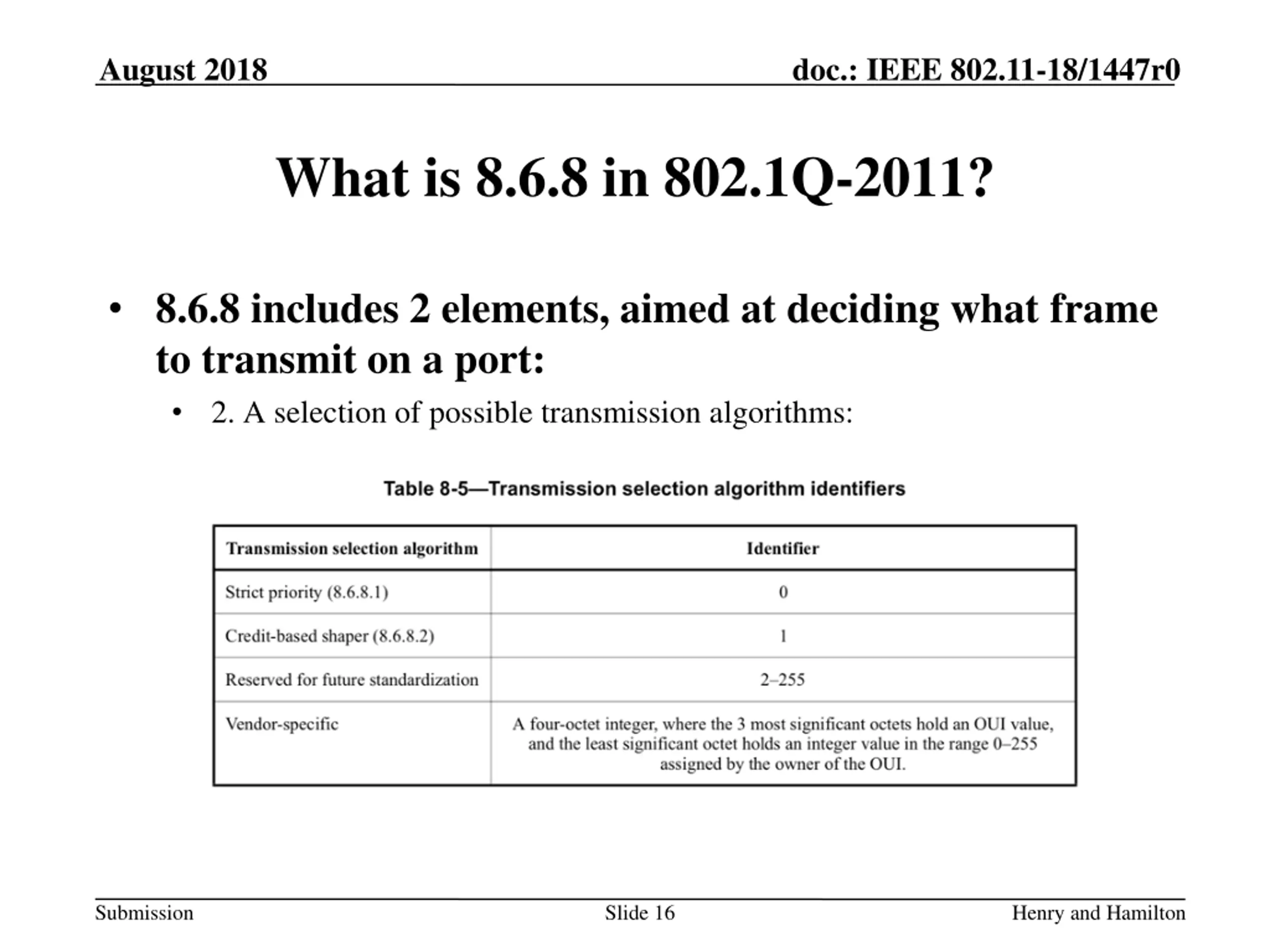 August 2018 doc.: IEEE 802.11-18/1447r0 What is 8.6.8 in 802.1Q-2011? 8.6.8 includes 2 elements, aimed at deciding what frame to transmit on a port: 1. A general provision (transmit if there is a frame): transmit if and only if: The operation of the transmission selection algorithm supported by that queue determines that there is a frame available for transmission; and For each queue corresponding to a numerically higher value of traffic class supported by the Port, the operation of the transmission selection algorithm supported by that queue determines that there is no frame available for transmission. Submission Slide 15 Henry and Hamilton