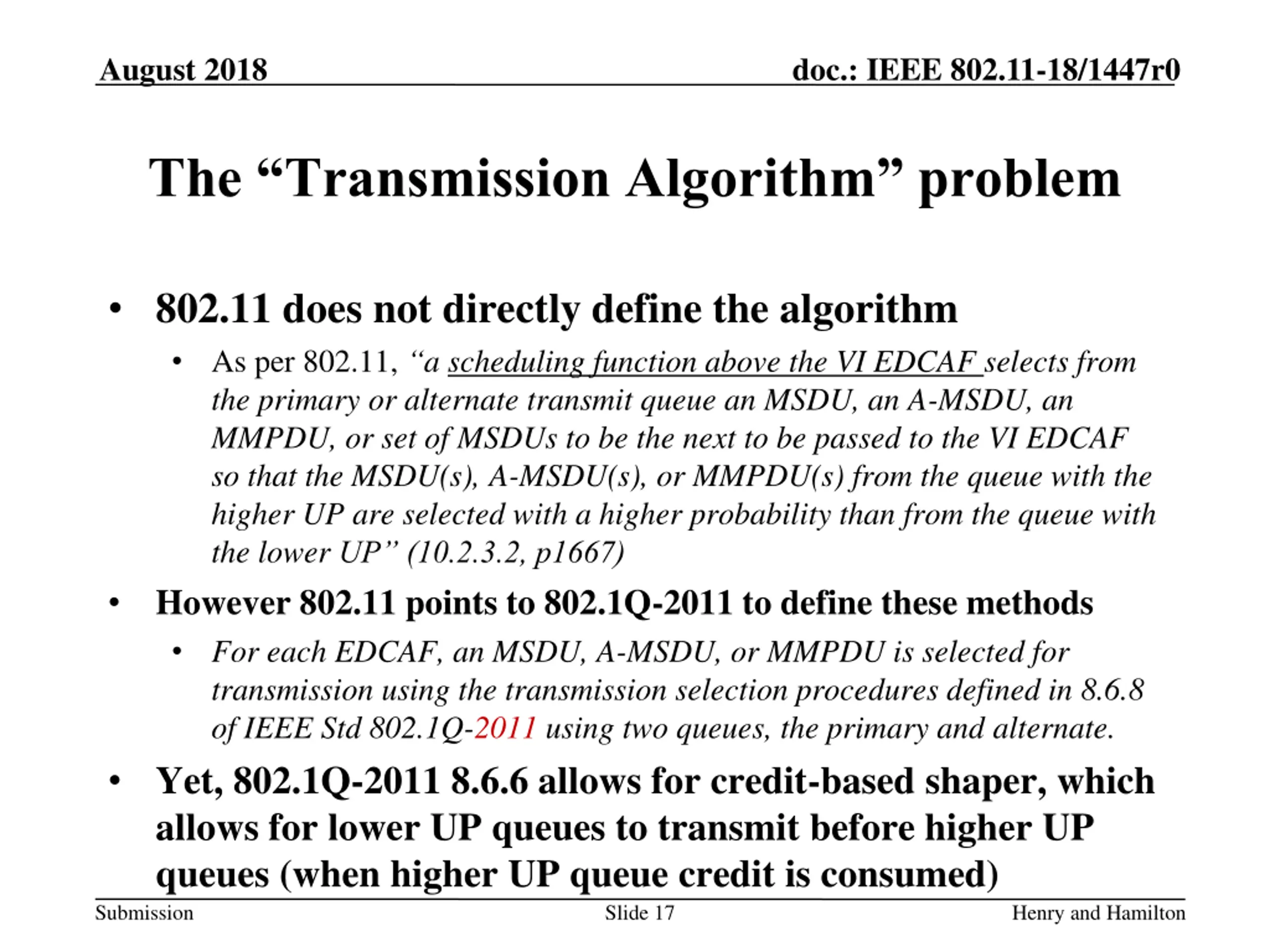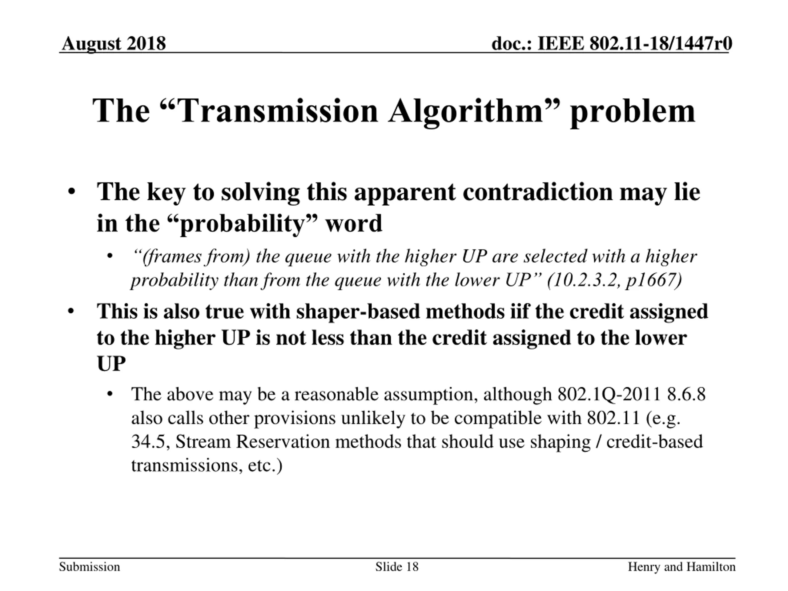 August 2018 doc.: IEEE 802.11-18/1447r0 The Transmission Algorithm problem 802.11 does not directly define the algorithm As per 802.11, a scheduling function above the VI EDCAF selects from the primary or alternate transmit queue an MSDU, an A-MSDU, an MMPDU, or set of MSDUs to be the next to be passed to the VI EDCAF so that the MSDU(s), A-MSDU(s), or MMPDU(s) from the queue with the higher UP are selected with a higher probability than from the queue with the lower UP (10.2.3.2, p1667) However 802.11 points to 802.1Q-2011 to define these methods For each EDCAF, an MSDU, A-MSDU, or MMPDU is selected for transmission using the transmission selection procedures defined in 8.6.8 of IEEE Std 802.1Q-2011 using two queues, the primary and alternate. Yet, 802.1Q-2011 8.6.6 allows for credit-based shaper, which allows for lower UP queues to transmit before higher UP queues (when higher UP queue credit is consumed) Submission Slide 17 Henry and Hamilton