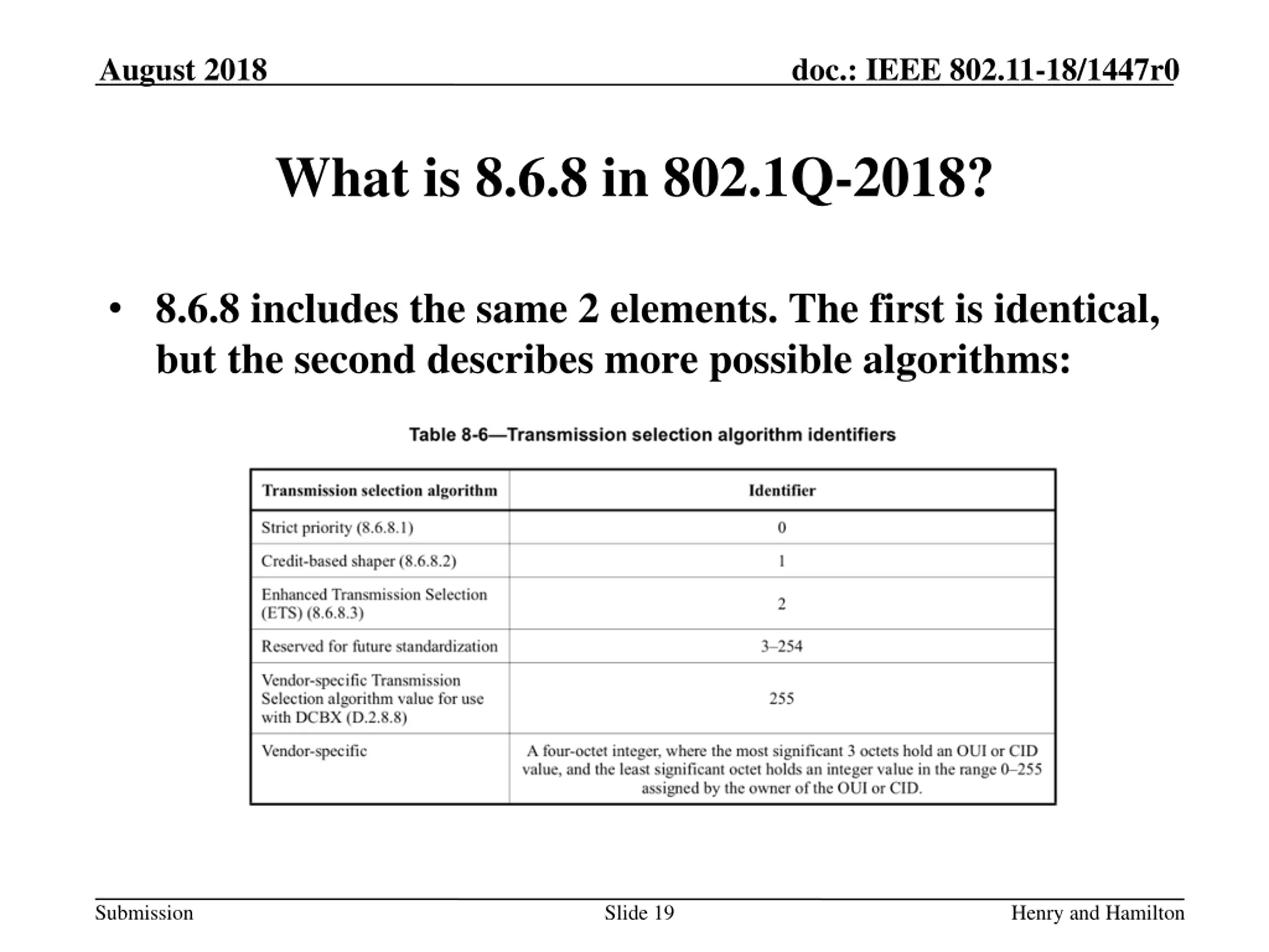 August 2018 doc.: IEEE 802.11-18/1447r0 What is 8.6.8 in 802.1Q-2018? 8.6.8 includes the same 2 elements. The first is identical, but the second describes more possible algorithms: Submission Slide 19 Henry and Hamilton