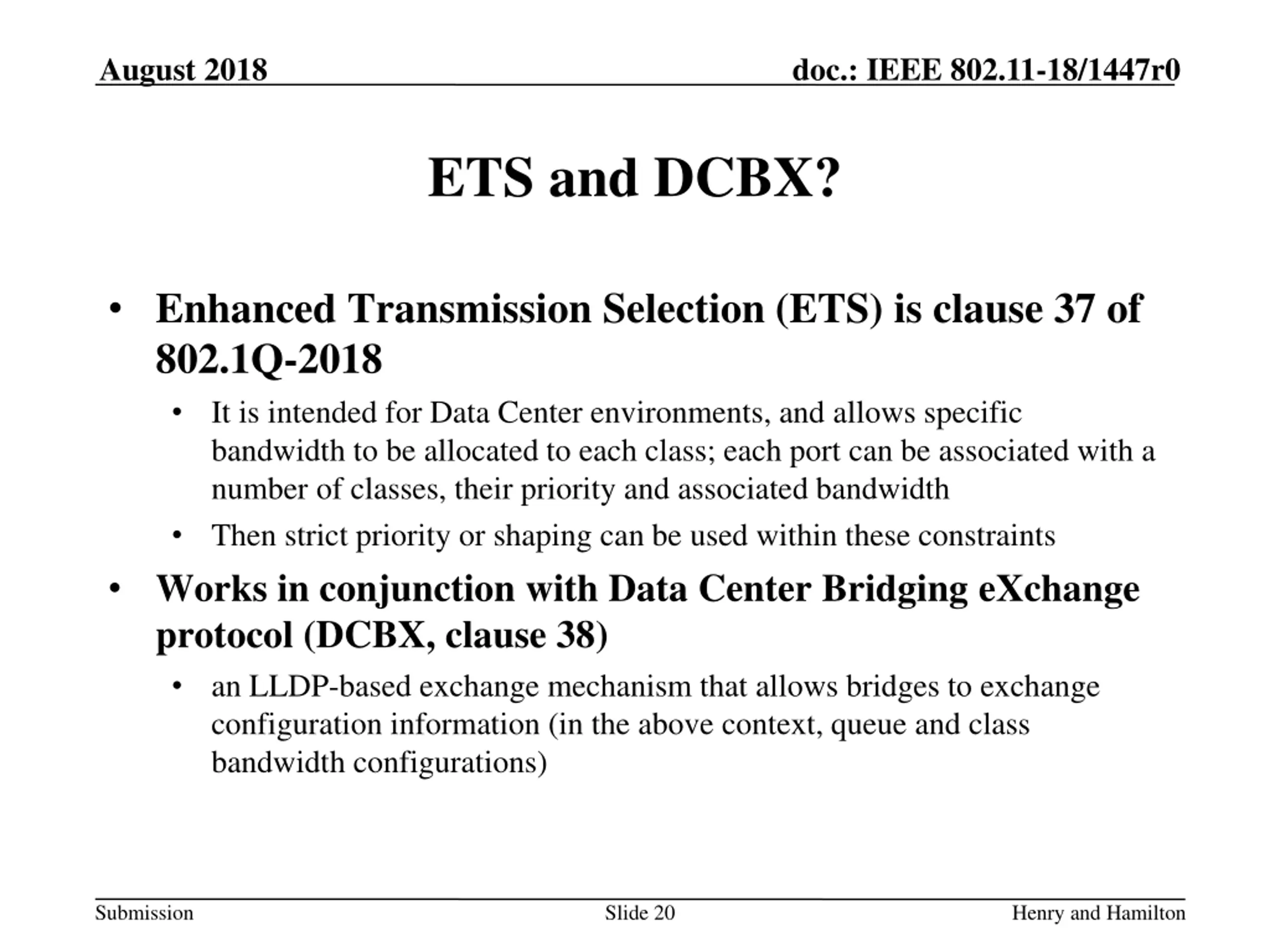 August 2018 doc.: IEEE 802.11-18/1447r0 ETS and DCBX? Enhanced Transmission Selection (ETS) is clause 37 of 802.1Q-2018 It is intended for Data Center environments, and allows specific bandwidth to be allocated to each class; each port can be associated with a number of classes, their priority and associated bandwidth Then strict priority or shaping can be used within these constraints Works in conjunction with Data Center Bridging eXchange protocol (DCBX, clause 38) an LLDP-based exchange mechanism that allows bridges to exchange configuration information (in the above context, queue and class bandwidth configurations) Submission Slide 20 Henry and Hamilton