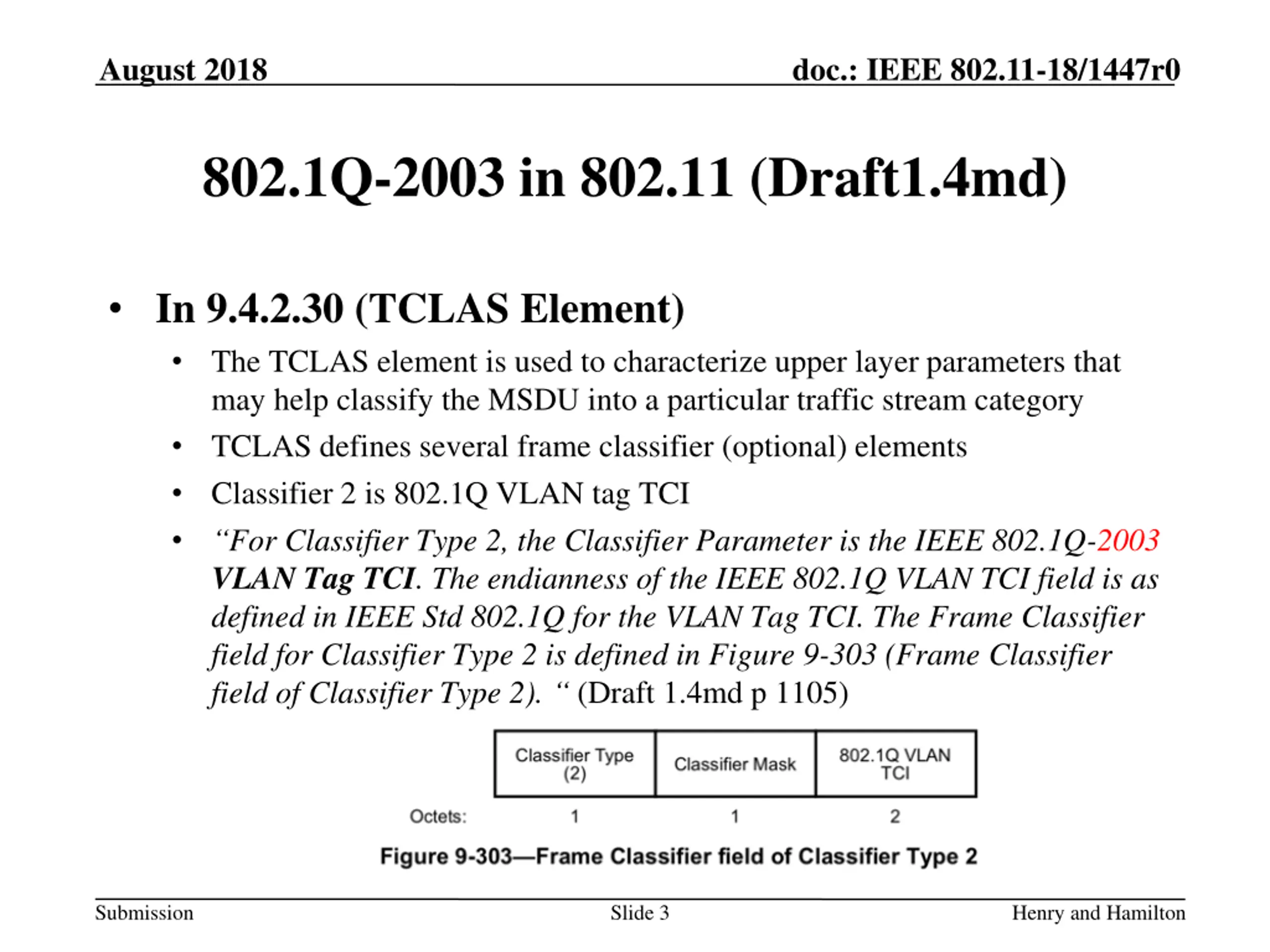 August 2018 doc.: IEEE 802.11-18/1447r0 802.1Q-2003 in 802.11 (Draft1.4md) In 9.4.2.30 (TCLAS Element) The TCLAS element is used to characterize upper layer parameters that may help classify the MSDU into a particular traffic stream category TCLAS defines several frame classifier (optional) elements Classifier 2 is 802.1Q VLAN tag TCI For Classifier Type 2, the Classifier Parameter is the IEEE 802.1Q-2003 VLAN Tag TCI. The endianness of the IEEE 802.1Q VLAN TCI field is as defined in IEEE Std 802.1Q for the VLAN Tag TCI. The Frame Classifier field for Classifier Type 2 is defined in Figure 9-303 (Frame Classifier field of Classifier Type 2). (Draft 1.4md p 1105) Submission Slide 3 Henry and Hamilton