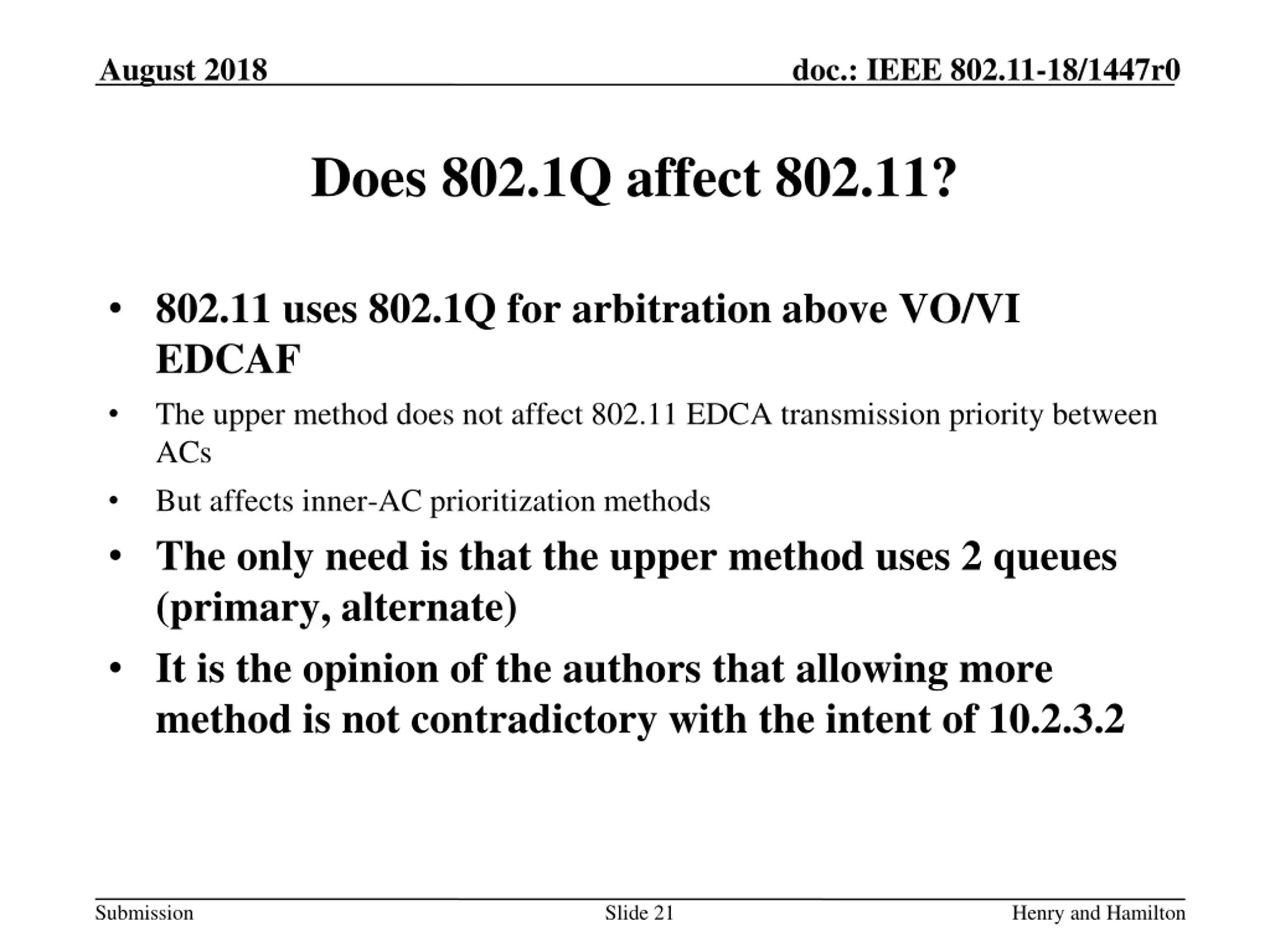 August 2018 doc.: IEEE 802.11-18/1447r0 Does 802.1Q affect 802.11? 802.11 uses 802.1Q for arbitration above VO/VI EDCAF The upper method does not affect 802.11 EDCA transmission priority between ACs But affects inner-AC prioritization methods The only need is that the upper method uses 2 queues (primary, alternate) It is the opinion of the authors that allowing more method is not contradictory with the intent of 10.2.3.2 Submission Slide 21 Henry and Hamilton