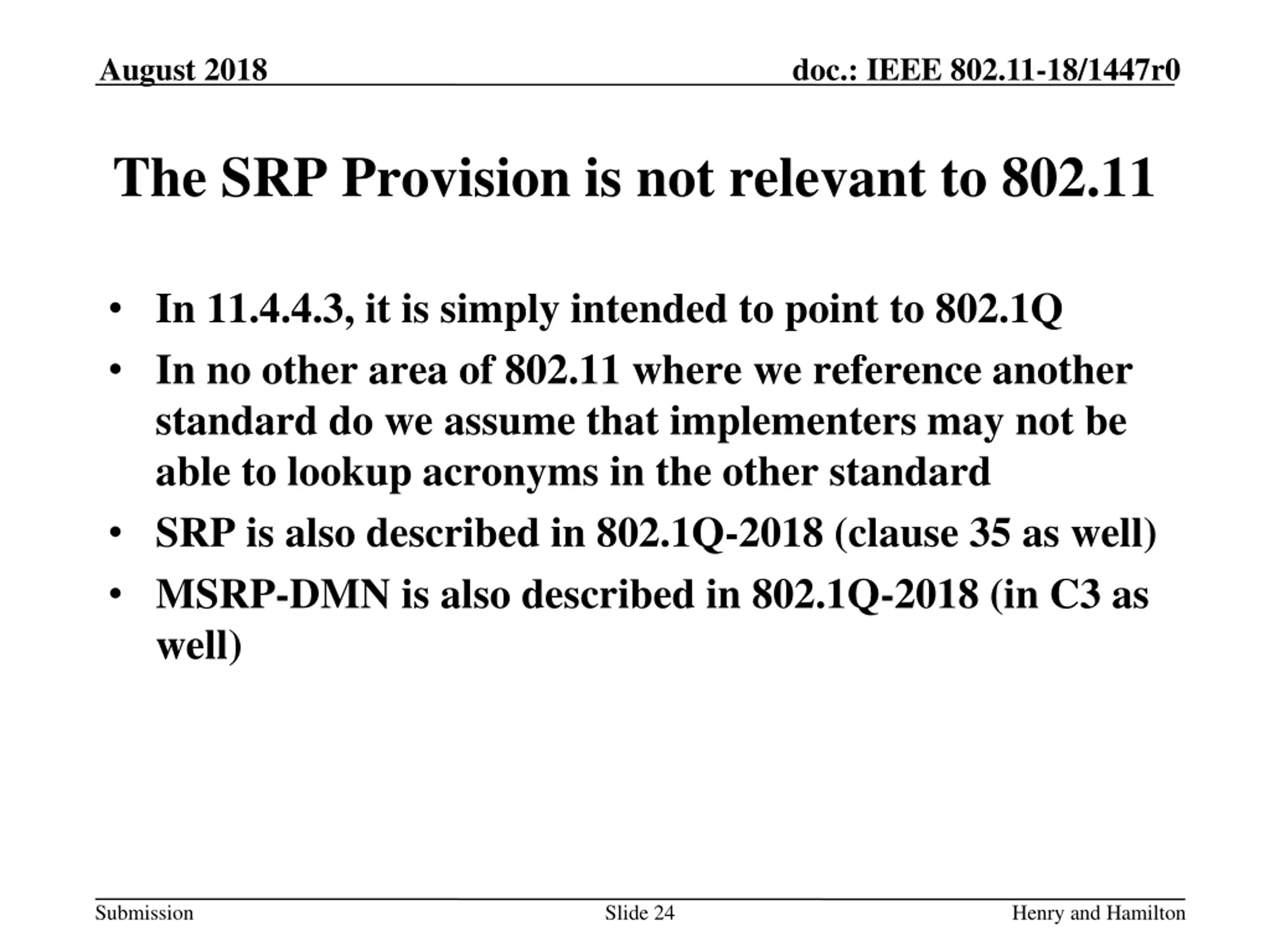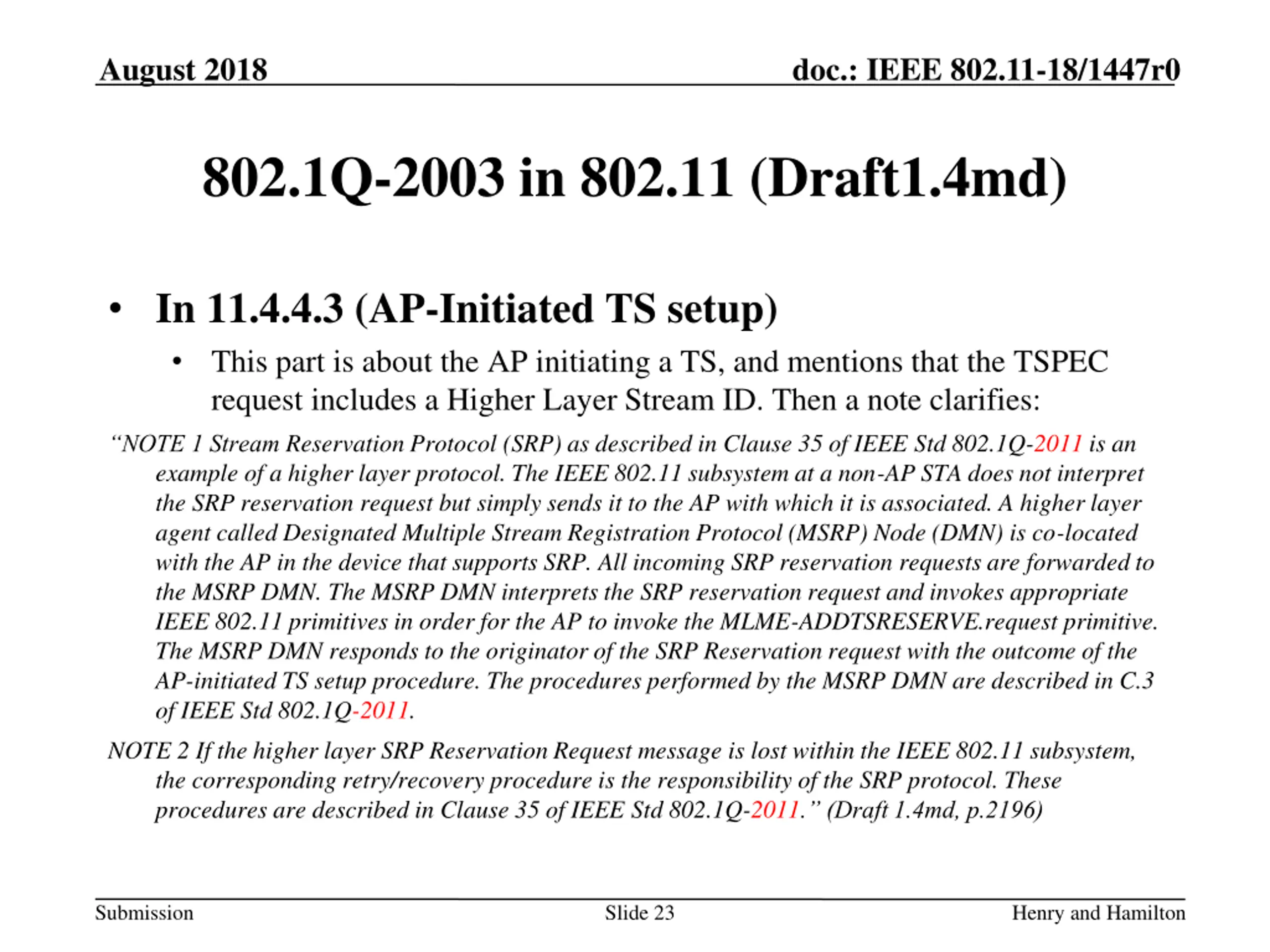 August 2018 doc.: IEEE 802.11-18/1447r0 802.1Q-2003 in 802.11 (Draft1.4md) In 11.4.4.3 (AP-Initiated TS setup) This part is about the AP initiating a TS, and mentions that the TSPEC request includes a Higher Layer Stream ID. Then a note clarifies: NOTE 1 Stream Reservation Protocol (SRP) as described in Clause 35 of IEEE Std 802.1Q-2011 is an example of a higher layer protocol. The IEEE 802.11 subsystem at a non-AP STA does not interpret the SRP reservation request but simply sends it to the AP with which it is associated. A higher layer agent called Designated Multiple Stream Registration Protocol (MSRP) Node (DMN) is co-located with the AP in the device that supports SRP. All incoming SRP reservation requests are forwarded to the MSRP DMN. The MSRP DMN interprets the SRP reservation request and invokes appropriate IEEE 802.11 primitives in order for the AP to invoke the MLME-ADDTSRESERVE.request primitive. The MSRP DMN responds to the originator of the SRP Reservation request with the outcome of the AP-initiated TS setup procedure. The procedures performed by the MSRP DMN are described in C.3 of IEEE Std 802.1Q-2011. NOTE 2 If the higher layer SRP Reservation Request message is lost within the IEEE 802.11 subsystem, the corresponding retry/recovery procedure is the responsibility of the SRP protocol. These procedures are described in Clause 35 of IEEE Std 802.1Q-2011. (Draft 1.4md, p.2196) Submission Slide 23 Henry and Hamilton
