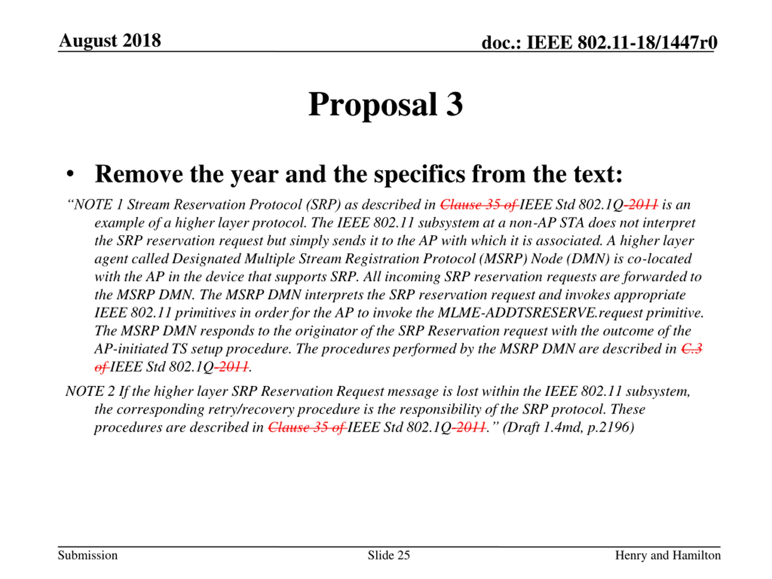 August 2018 doc.: IEEE 802.11-18/1447r0 Proposal 3 Remove the year and the specifics from the text: NOTE 1 Stream Reservation Protocol (SRP) as described in Clause 35 of IEEE Std 802.1Q-2011 is an example of a higher layer protocol. The IEEE 802.11 subsystem at a non-AP STA does not interpret the SRP reservation request but simply sends it to the AP with which it is associated. A higher layer agent called Designated Multiple Stream Registration Protocol (MSRP) Node (DMN) is co-located with the AP in the device that supports SRP. All incoming SRP reservation requests are forwarded to the MSRP DMN. The MSRP DMN interprets the SRP reservation request and invokes appropriate IEEE 802.11 primitives in order for the AP to invoke the MLME-ADDTSRESERVE.request primitive. The MSRP DMN responds to the originator of the SRP Reservation request with the outcome of the AP-initiated TS setup procedure. The procedures performed by the MSRP DMN are described in C.3 of IEEE Std 802.1Q-2011. NOTE 2 If the higher layer SRP Reservation Request message is lost within the IEEE 802.11 subsystem, the corresponding retry/recovery procedure is the responsibility of the SRP protocol. These procedures are described in Clause 35 of IEEE Std 802.1Q-2011. (Draft 1.4md, p.2196) Submission Slide 25 Henry and Hamilton