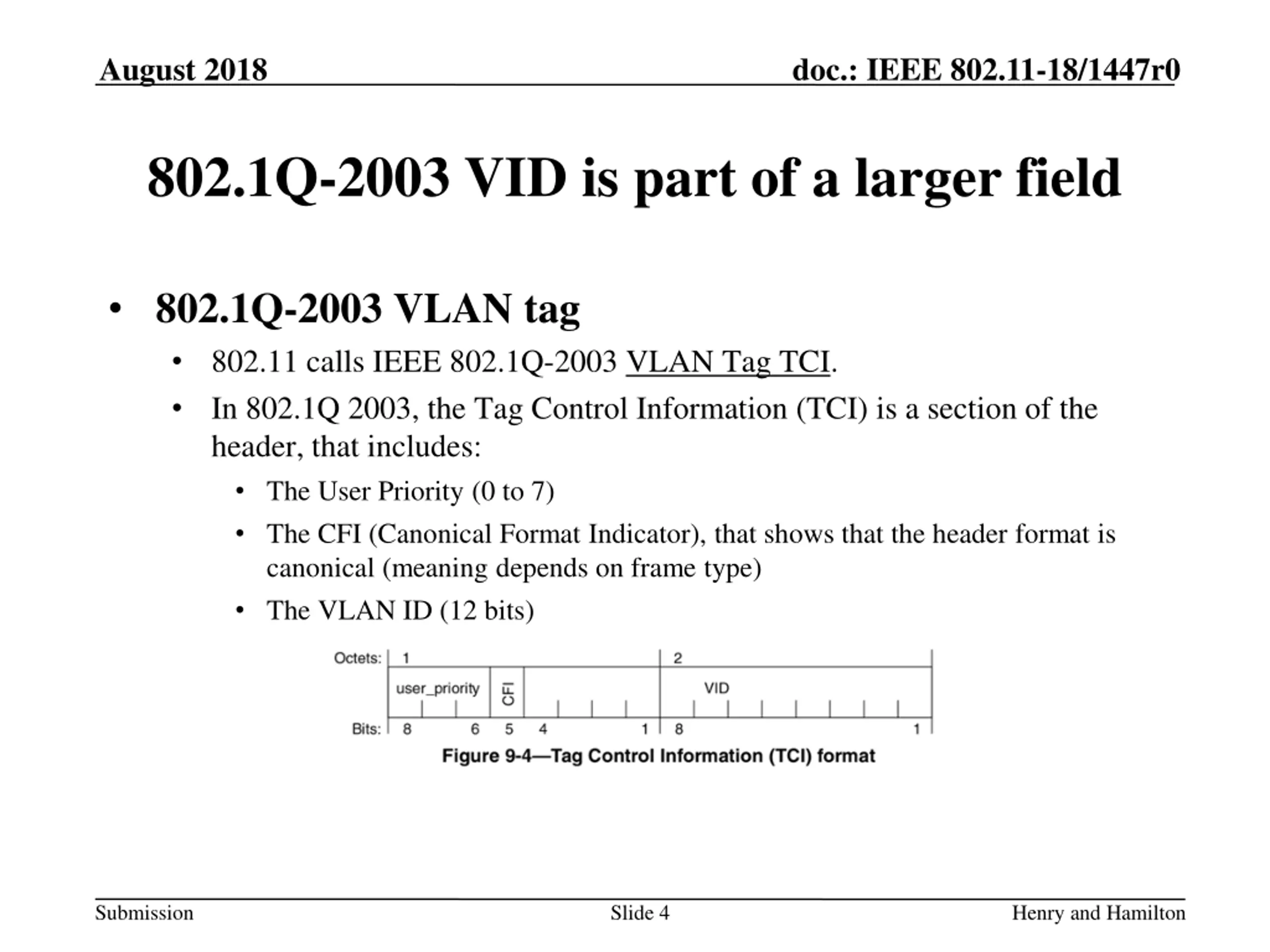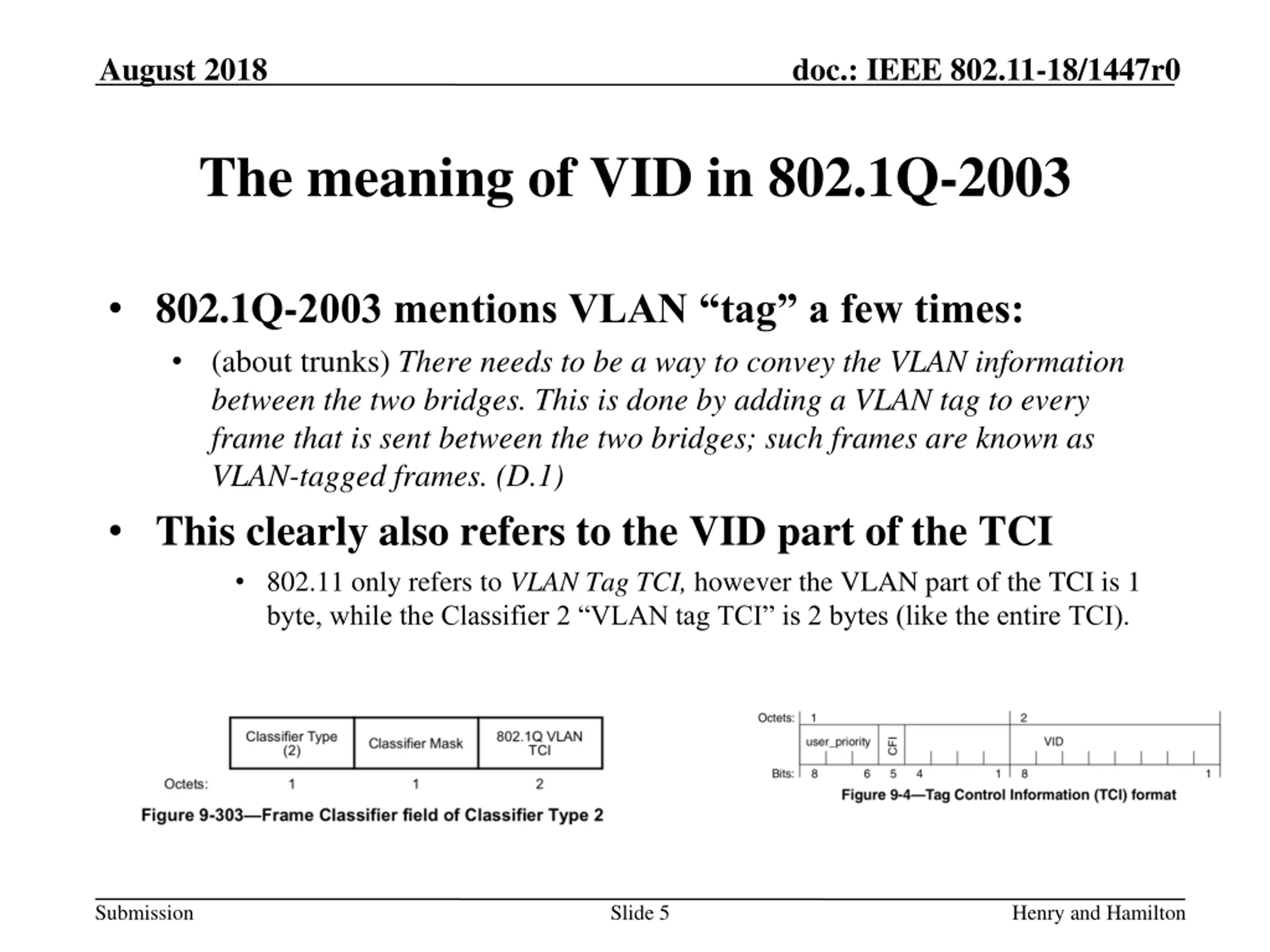 August 2018 doc.: IEEE 802.11-18/1447r0 802.1Q-2003 VID is part of a larger field 802.1Q-2003 VLAN tag 802.11 calls IEEE 802.1Q-2003 VLAN Tag TCI. In 802.1Q 2003, the Tag Control Information (TCI) is a section of the header, that includes: The User Priority (0 to 7) The CFI (Canonical Format Indicator), that shows that the header format is canonical (meaning depends on frame type) The VLAN ID (12 bits) Submission Slide 4 Henry and Hamilton