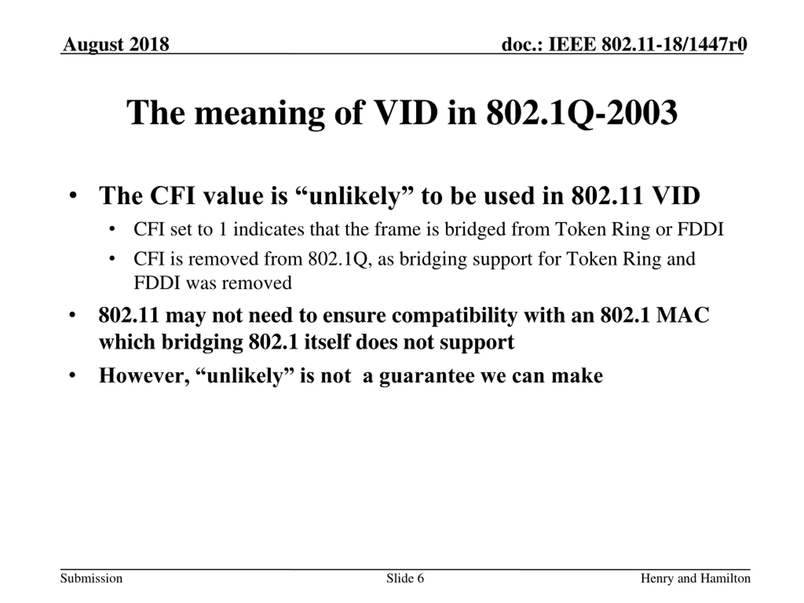 August 2018 doc.: IEEE 802.11-18/1447r0 The meaning of VID in 802.1Q-2003 The CFI value is unlikely to be used in 802.11 VID CFI set to 1 indicates that the frame is bridged from Token Ring or FDDI CFI is removed from 802.1Q, as bridging support for Token Ring and FDDI was removed 802.11 may not need to ensure compatibility with an 802.1 MAC which bridging 802.1 itself does not support However, unlikely is not a guarantee we can make Submission Slide 6 Henry and Hamilton
