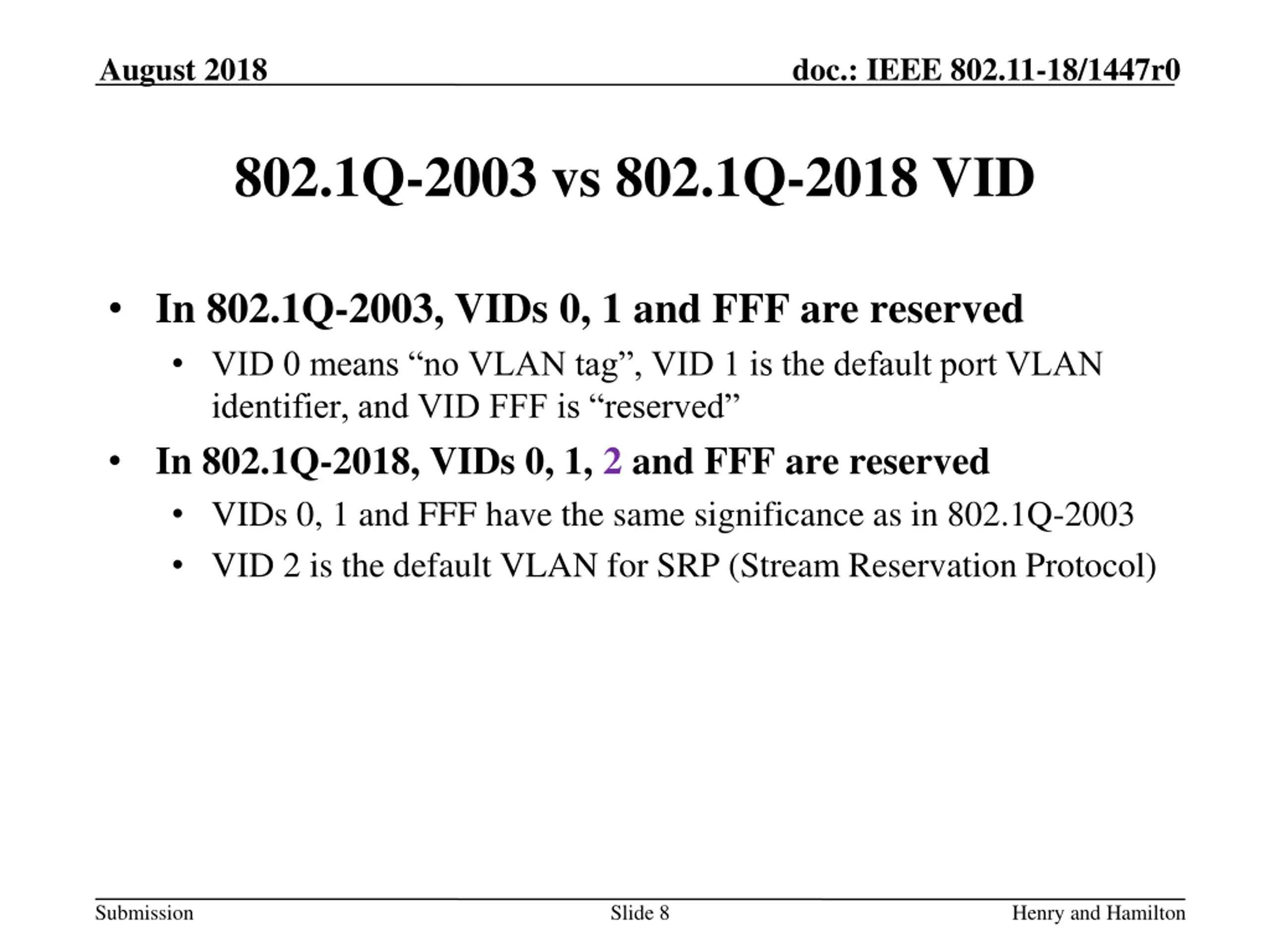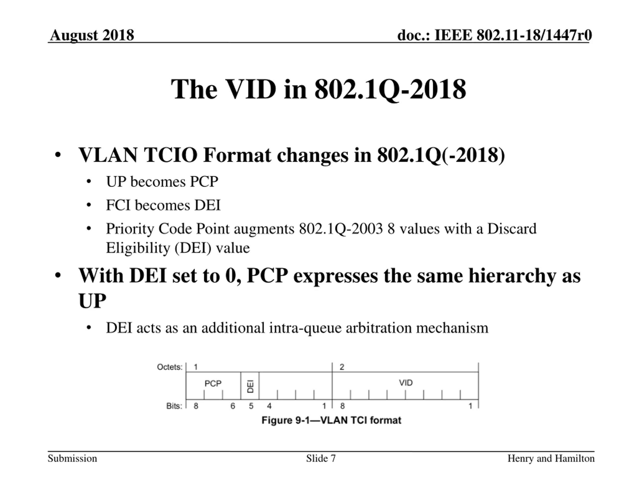 August 2018 doc.: IEEE 802.11-18/1447r0 The VID in 802.1Q-2018 VLAN TCIO Format changes in 802.1Q(-2018) UP becomes PCP FCI becomes DEI Priority Code Point augments 802.1Q-2003 8 values with a Discard Eligibility (DEI) value With DEI set to 0, PCP expresses the same hierarchy as UP DEI acts as an additional intra-queue arbitration mechanism Submission Slide 7 Henry and Hamilton