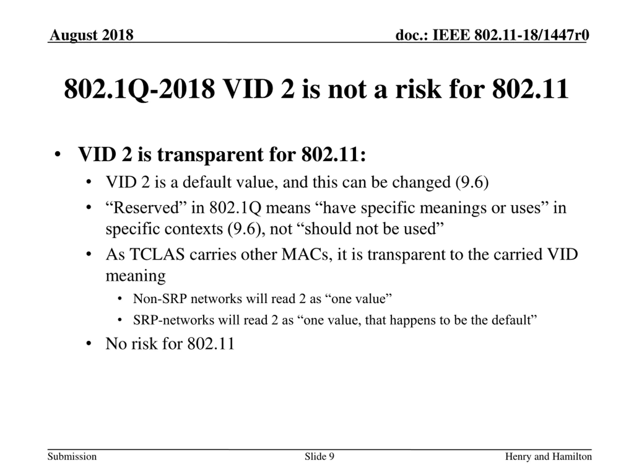 August 2018 doc.: IEEE 802.11-18/1447r0 802.1Q-2003 vs 802.1Q-2018 VID In 802.1Q-2003, VIDs 0, 1 and FFF are reserved VID 0 means no VLAN tag , VID 1 is the default port VLAN identifier, and VID FFF is reserved In 802.1Q-2018, VIDs 0, 1, 2 and FFF are reserved VIDs 0, 1 and FFF have the same significance as in 802.1Q-2003 VID 2 is the default VLAN for SRP (Stream Reservation Protocol) Submission Slide 8 Henry and Hamilton