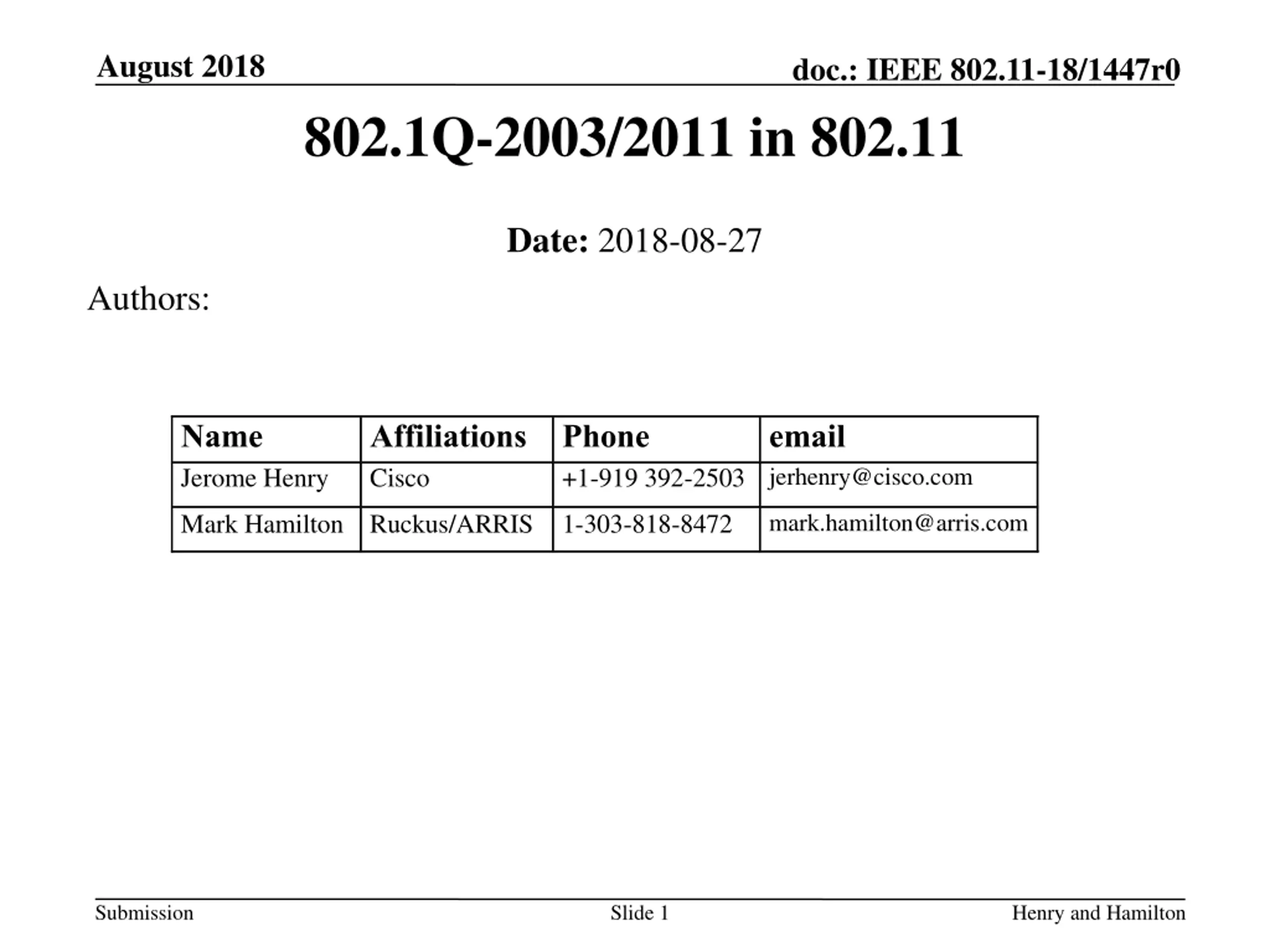 August 2018 doc.: IEEE 802.11-18/1447r0 802.1Q-2003/2011 in 802.11 Date: 2018-08-27 Authors: Name Jerome Henry Affiliations Phone Cisco email +1-919 392-2503 jerhenry@cisco.com mark.hamilton@arris.com Mark Hamilton Ruckus/ARRIS 1-303-818-8472 Submission Slide 1 Henry and Hamilton