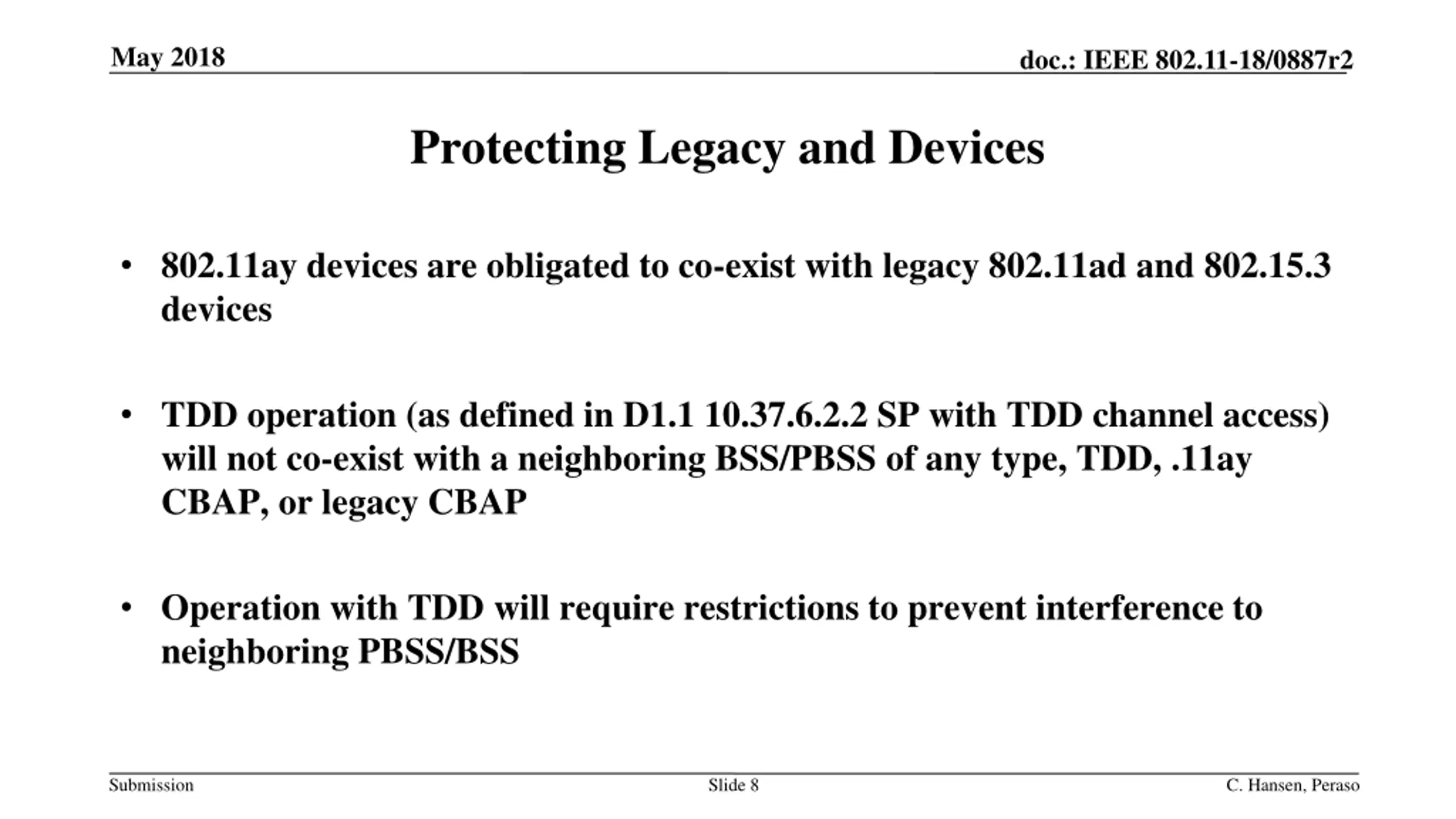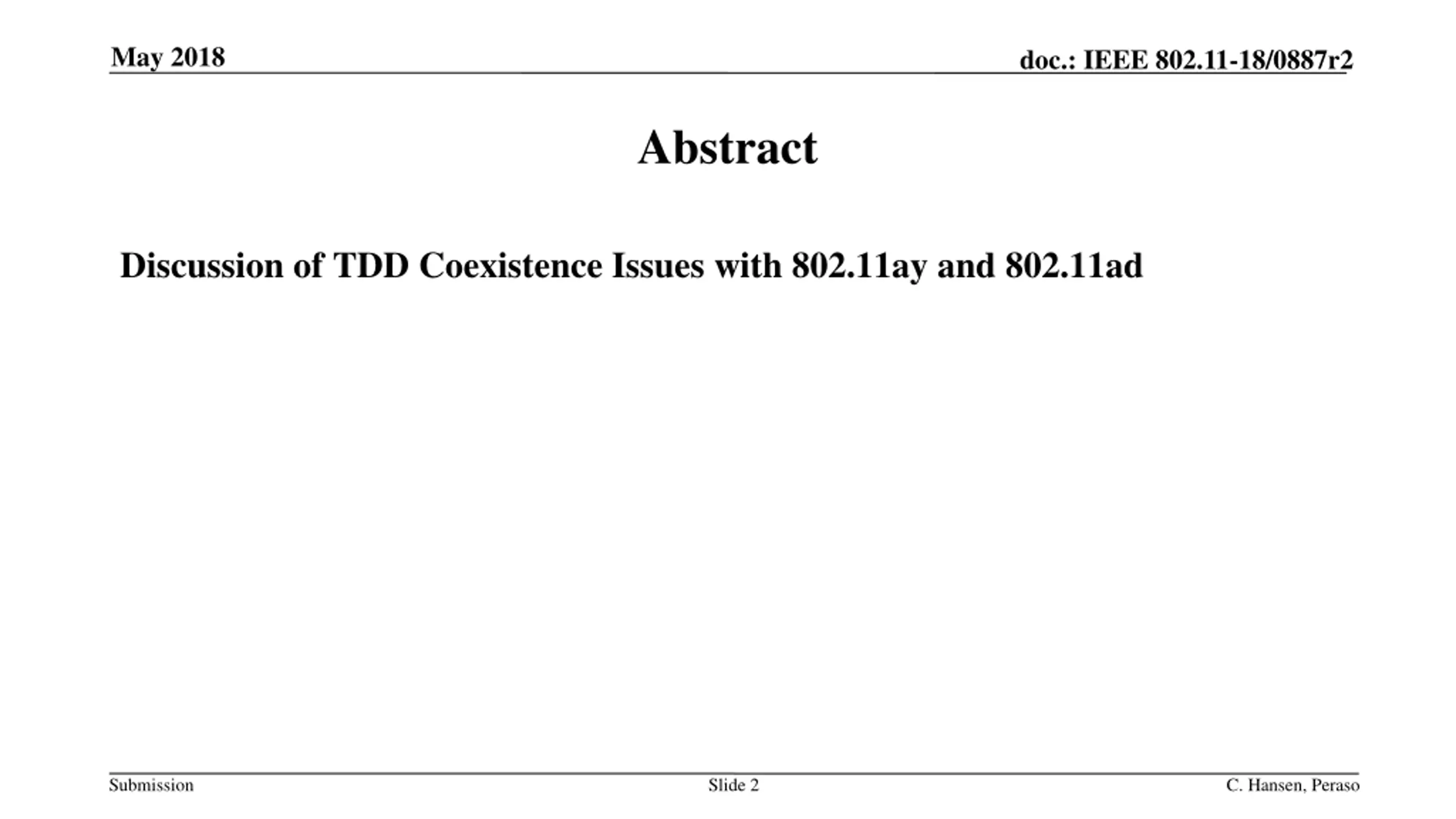 May 2018 doc.: IEEE 802.11-18/0887r2 Abstract Discussion of TDD Coexistence Issues with 802.11ay and 802.11ad Submission Slide 2 C. Hansen, Peraso