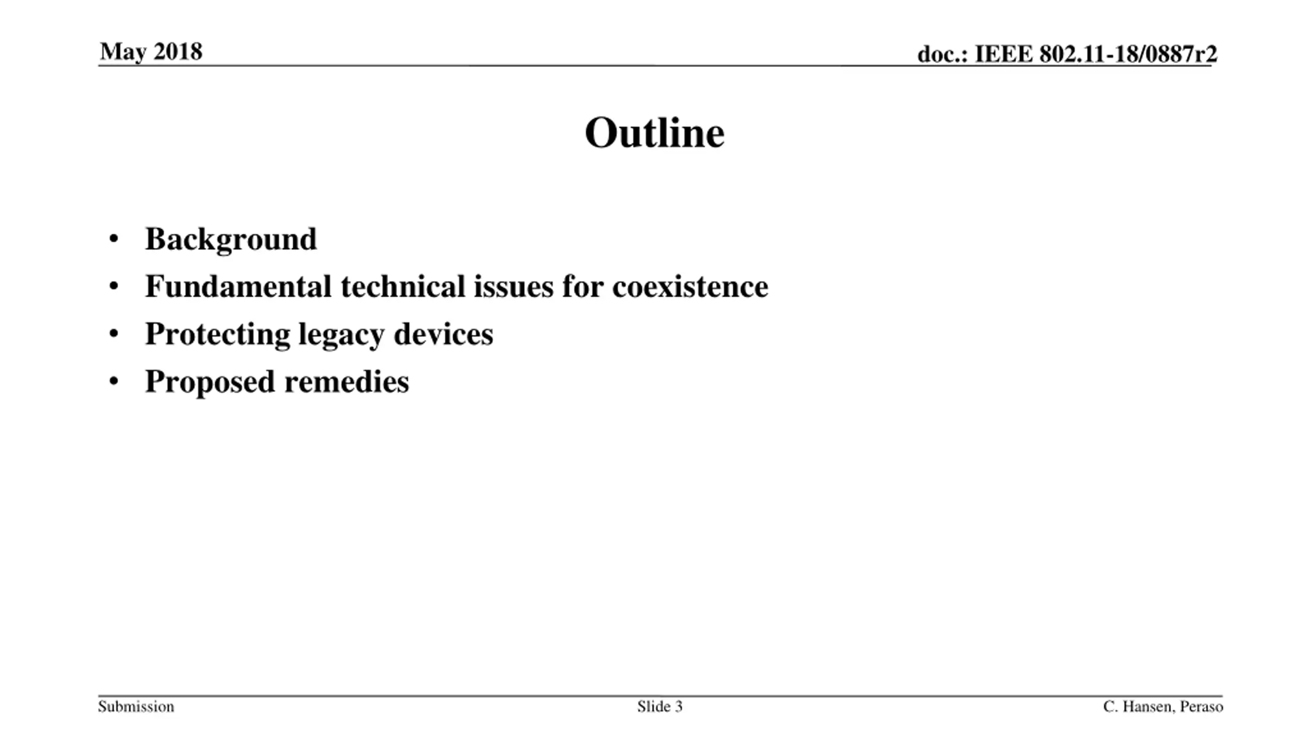 May 2018 doc.: IEEE 802.11-18/0887r2 Outline Background Fundamental technical issues for coexistence Protecting legacy devices Proposed remedies Submission Slide 3 C. Hansen, Peraso