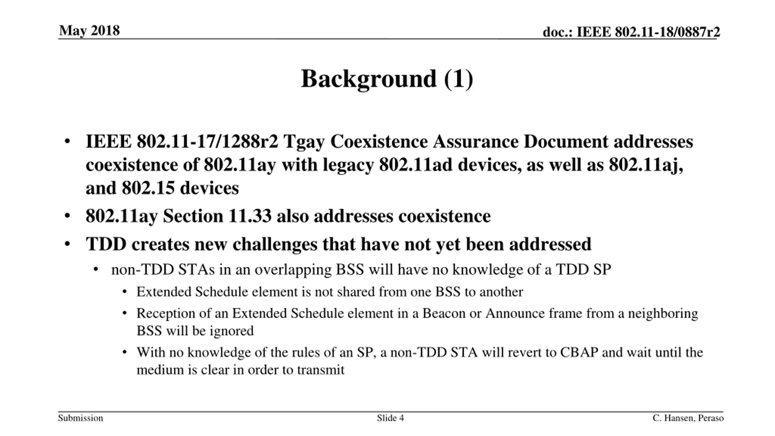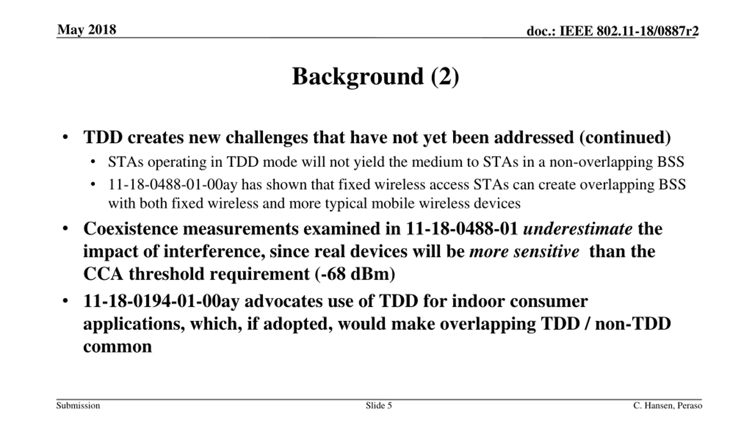 May 2018 doc.: IEEE 802.11-18/0887r2 Background (1) IEEE 802.11-17/1288r2 Tgay Coexistence Assurance Document addresses coexistence of 802.11ay with legacy 802.11ad devices, as well as 802.11aj, and 802.15 devices 802.11ay Section 11.33 also addresses coexistence TDD creates new challenges that have not yet been addressed non-TDD STAs in an overlapping BSS will have no knowledge of a TDD SP Extended Schedule element is not shared from one BSS to another Reception of an Extended Schedule element in a Beacon or Announce frame from a neighboring BSS will be ignored With no knowledge of the rules of an SP, a non-TDD STA will revert to CBAP and wait until the medium is clear in order to transmit Submission Slide 4 C. Hansen, Peraso