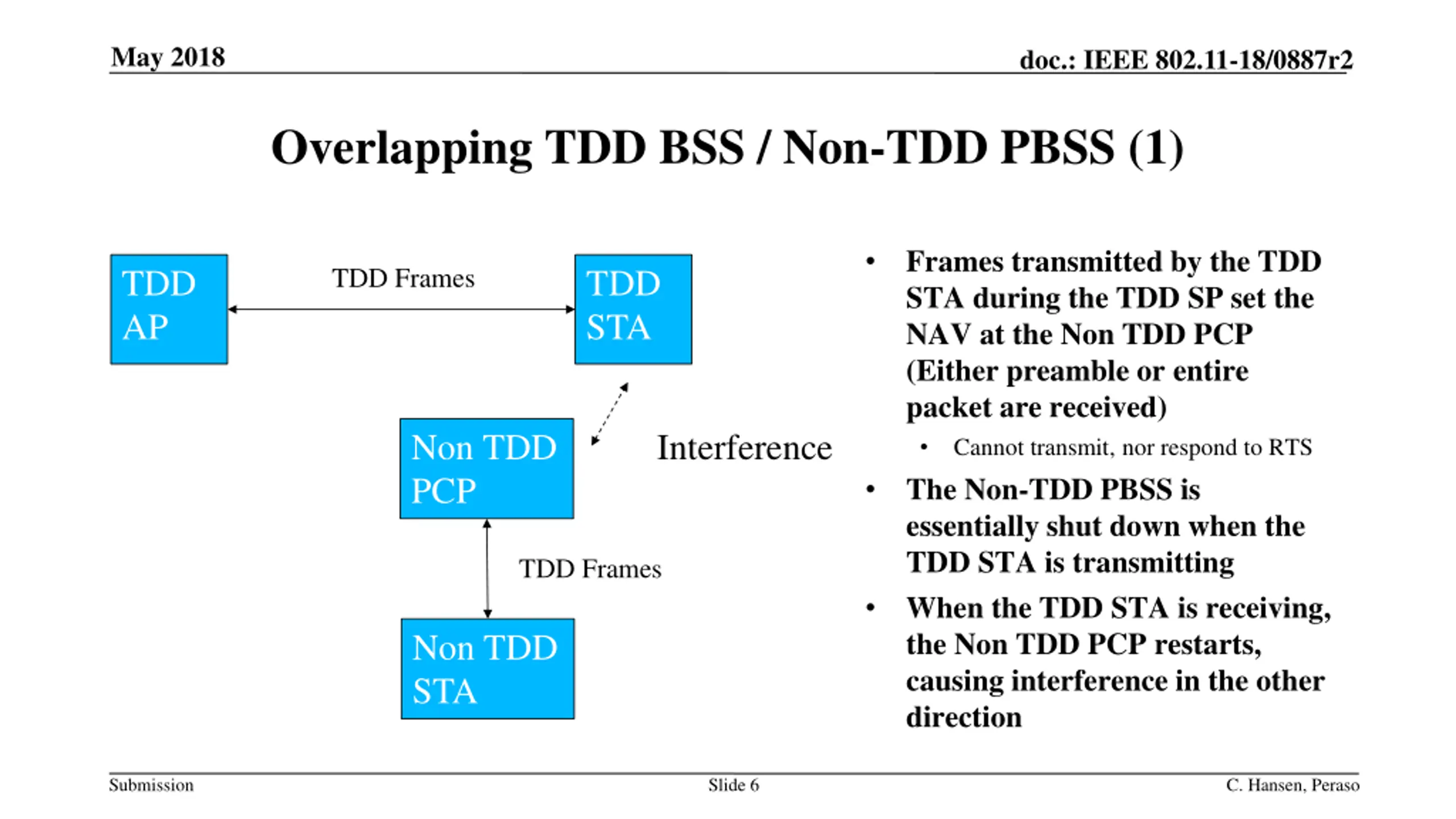 May 2018 doc.: IEEE 802.11-18/0887r2 Background (2) TDD creates new challenges that have not yet been addressed (continued) STAs operating in TDD mode will not yield the medium to STAs in a non-overlapping BSS 11-18-0488-01-00ay has shown that fixed wireless access STAs can create overlapping BSS with both fixed wireless and more typical mobile wireless devices Coexistence measurements examined in 11-18-0488-01 underestimate the impact of interference, since real devices will be more sensitive than the CCA threshold requirement (-68 dBm) 11-18-0194-01-00ay advocates use of TDD for indoor consumer applications, which, if adopted, would make overlapping TDD / non-TDD common Submission Slide 5 C. Hansen, Peraso