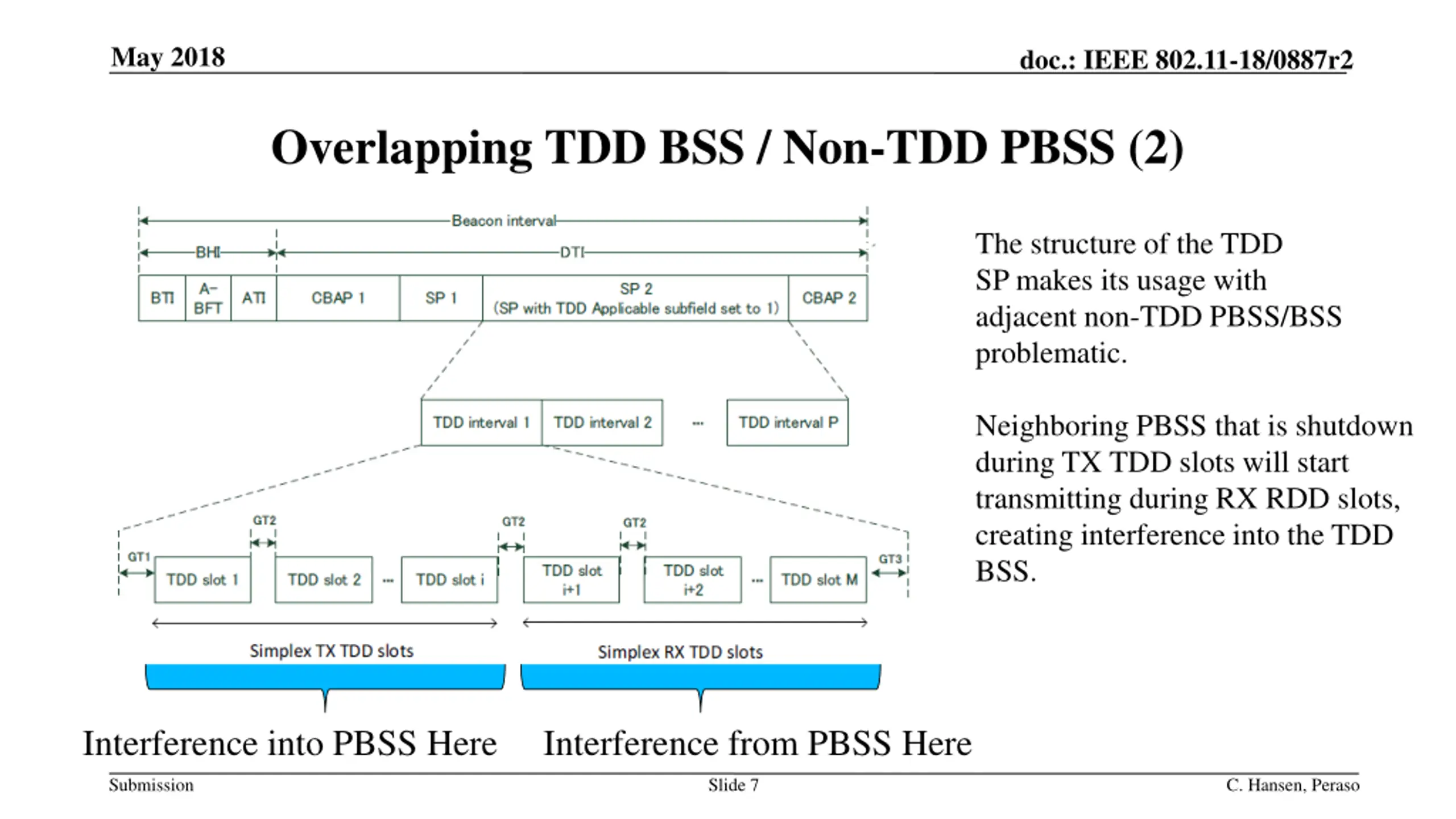 May 2018 doc.: IEEE 802.11-18/0887r2 Overlapping TDD BSS / Non-TDD PBSS (1) Frames transmitted by the TDD STA during the TDD SP set the NAV at the Non TDD PCP (Either preamble or entire packet are received) Cannot transmit, nor respond to RTS The Non-TDD PBSS is essentially shut down when the TDD STA is transmitting When the TDD STA is receiving, the Non TDD PCP restarts, causing interference in the other direction TDD Frames TDD AP TDD STA Non TDD PCP Interference TDD Frames Non TDD STA Submission Slide 6 C. Hansen, Peraso