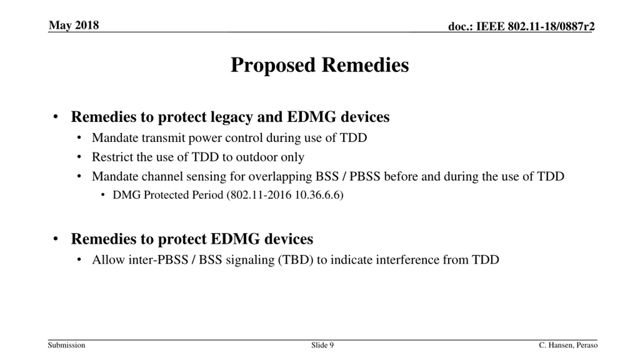 May 2018 doc.: IEEE 802.11-18/0887r2 Protecting Legacy and Devices 802.11ay devices are obligated to co-exist with legacy 802.11ad and 802.15.3 devices TDD operation (as defined in D1.1 10.37.6.2.2 SP with TDD channel access) will not co-exist with a neighboring BSS/PBSS of any type, TDD, .11ay CBAP, or legacy CBAP Operation with TDD will require restrictions to prevent interference to neighboring PBSS/BSS Submission Slide 8 C. Hansen, Peraso