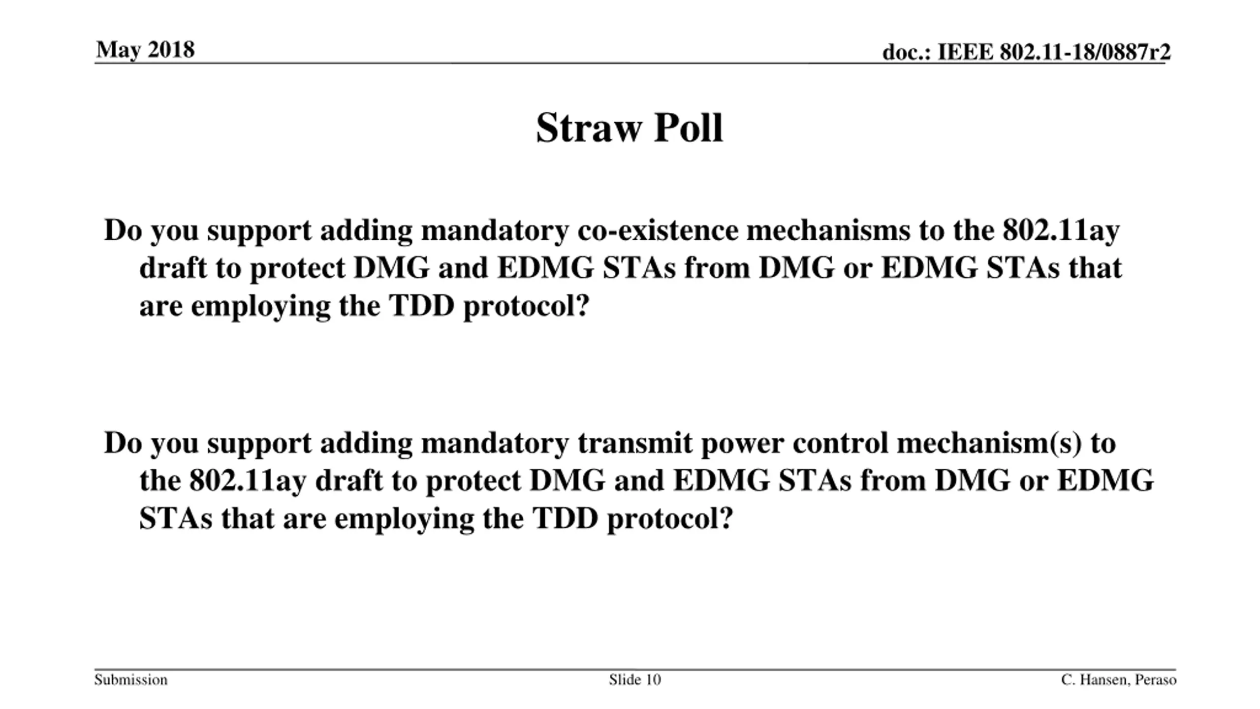 May 2018 doc.: IEEE 802.11-18/0887r2 Straw Poll Do you support adding mandatory co-existence mechanisms to the 802.11ay draft to protect DMG and EDMG STAs from DMG or EDMG STAs that are employing the TDD protocol? Do you support adding mandatory transmit power control mechanism(s) to the 802.11ay draft to protect DMG and EDMG STAs from DMG or EDMG STAs that are employing the TDD protocol? Submission Slide 10 C. Hansen, Peraso