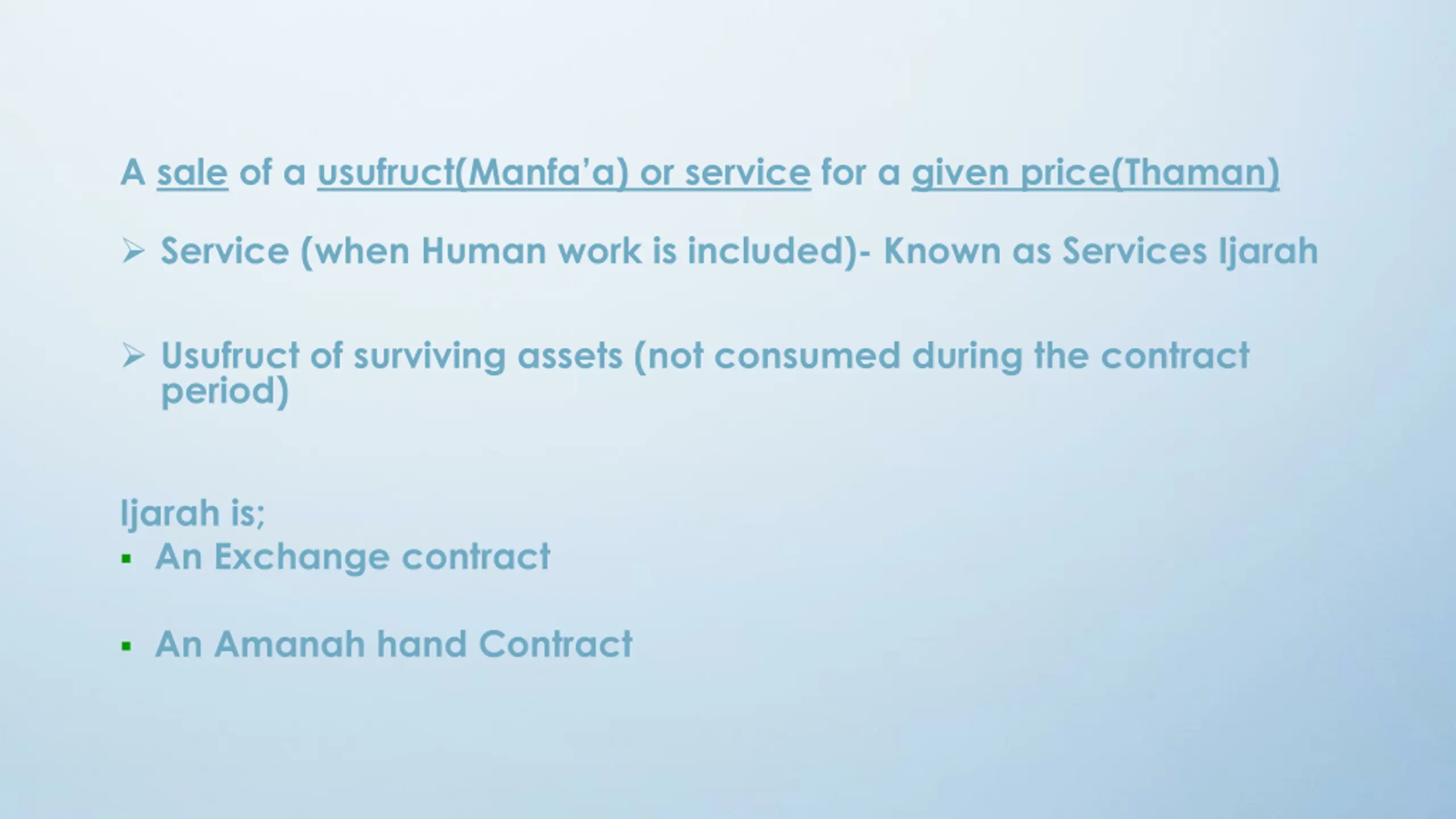A sale of a usufruct(Manfaa) or service for a given price(Thaman) Service (when Human work is included)- Known as Services Ijarah Usufruct of surviving assets (not consumed during the contract period) Ijarah is; An Exchange contract An Amanah hand Contract