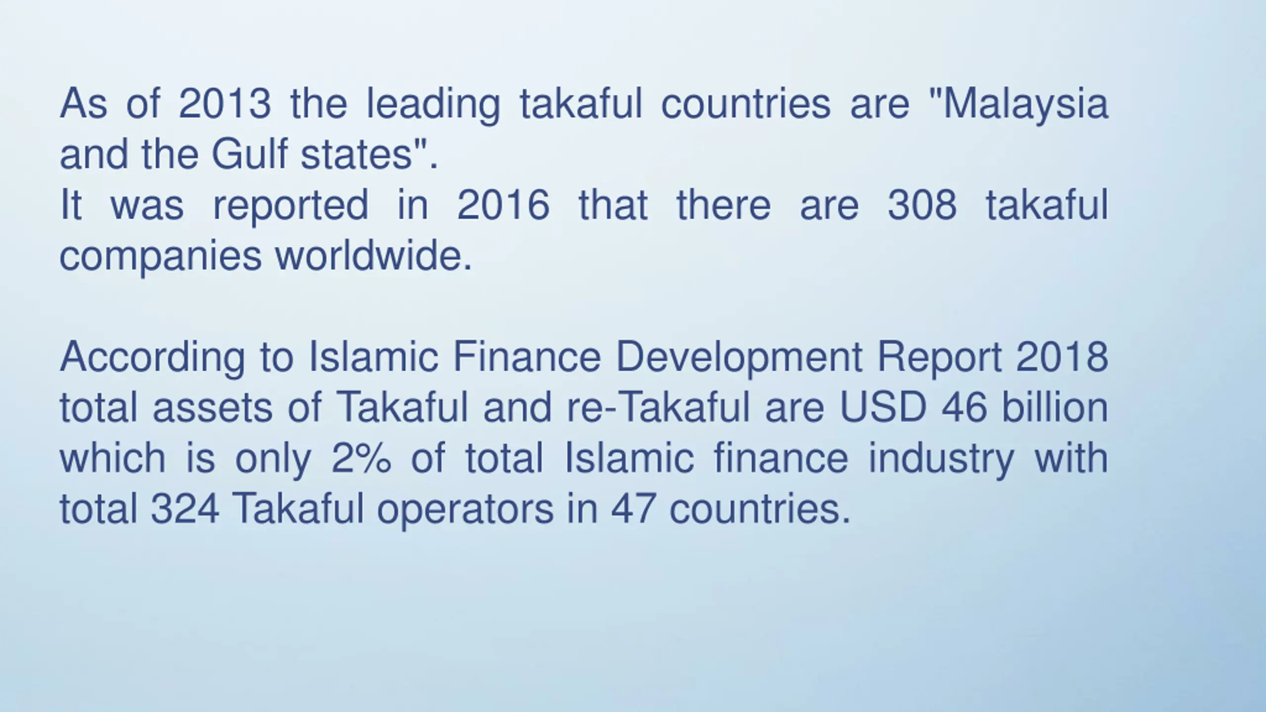 As of 2013 the leading takaful countries are "Malaysia and the Gulf states". It was reported in 2016 that there are 308 takaful companies worldwide. According to Islamic Finance Development Report 2018 total assets of Takaful and re-Takaful are USD 46 billion which is only 2% of total Islamic finance industry with total 324 Takaful operators in 47 countries.