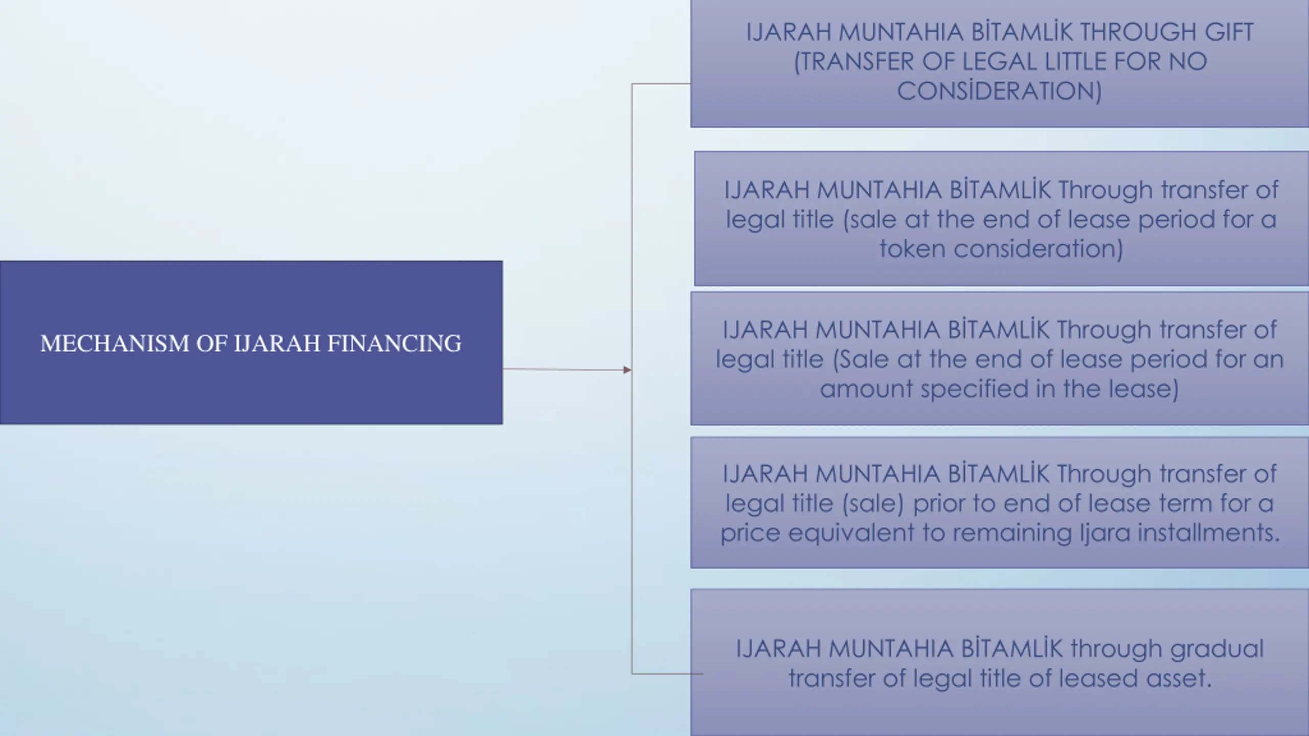 IJARAH MUNTAHIA BTAMLK THROUGH GIFT (TRANSFER OF LEGAL LITTLE FOR NO CONS DERATION) IJARAH MUNTAHIA B TAML K Through transfer of legal title (sale at the end of lease period for a token consideration) IJARAH MUNTAHIA B TAML K Through transfer of legal title (Sale at the end of lease period for an amount specified in the lease) MECHANISM OF IJARAH FINANCING IJARAH MUNTAHIA B TAML K Through transfer of legal title (sale) prior to end of lease term for a price equivalent to remaining Ijara installments. IJARAH MUNTAHIA B TAML K through gradual transfer of legal title of leased asset.