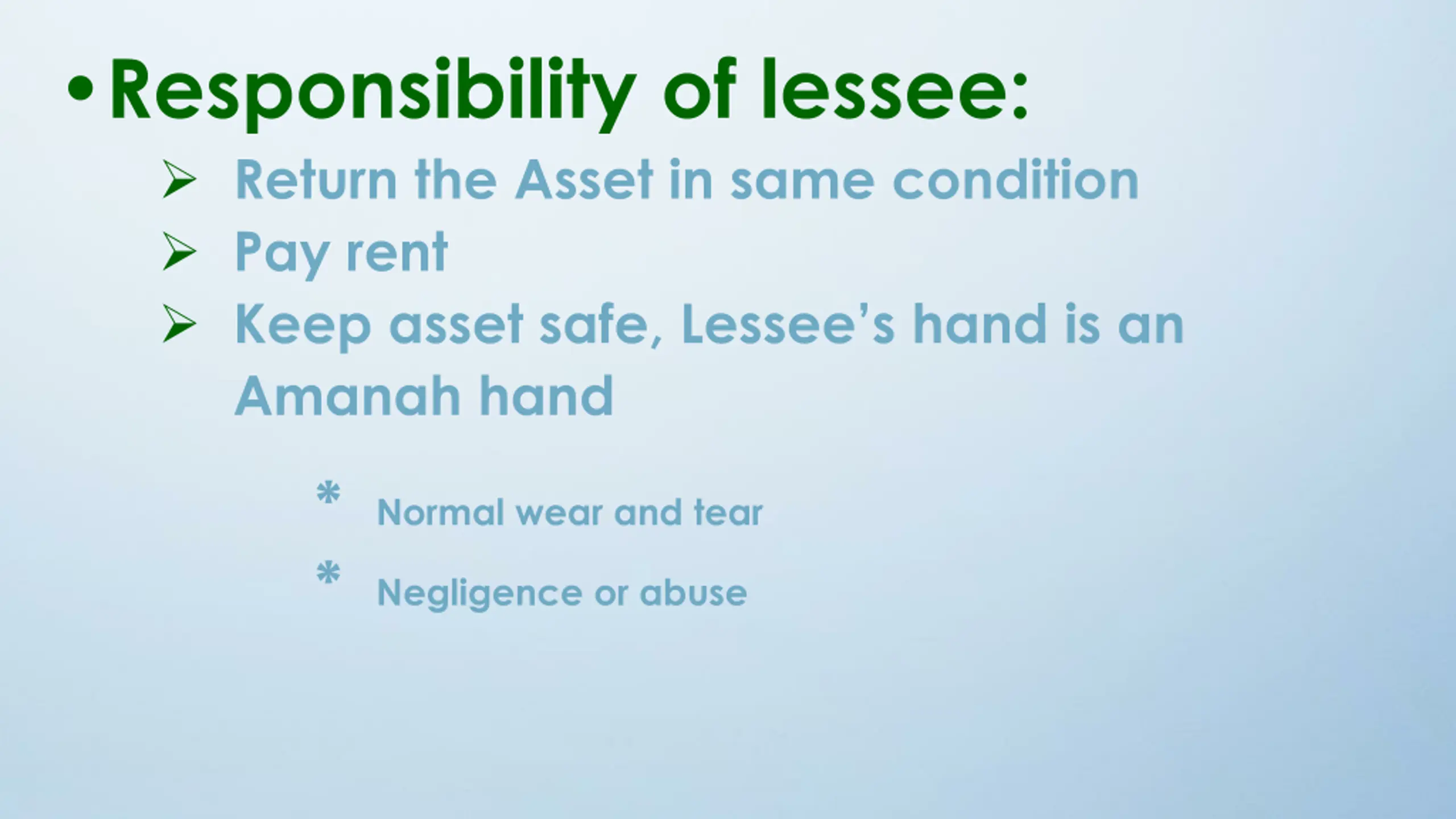 Responsibility of lessee: Return the Asset in same condition Pay rent Keep asset safe, Lessee s hand is an Amanah hand * Normal wear and tear * Negligence or abuse