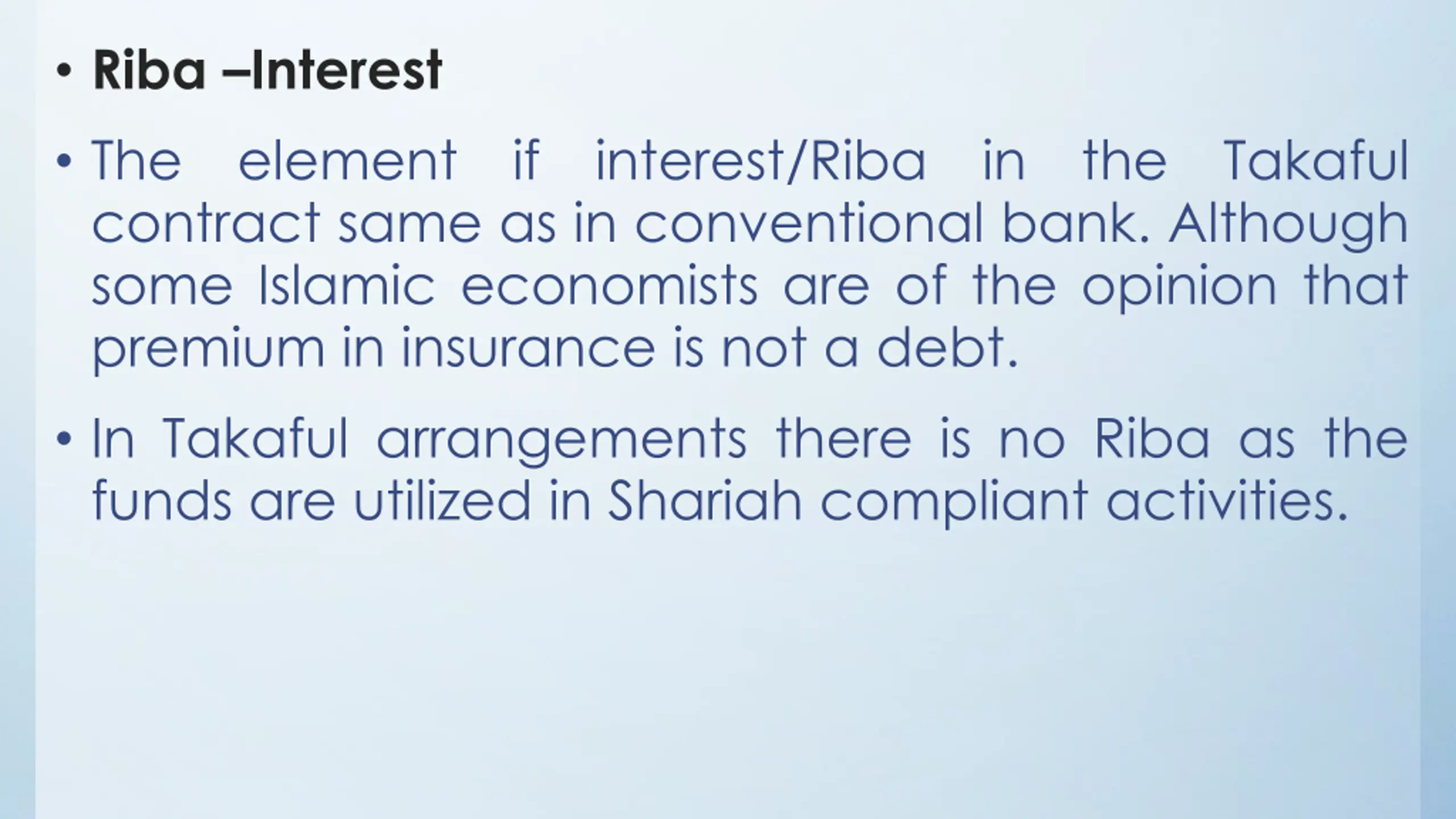 Riba Interest The element if interest/Riba in the Takaful contract same as in conventional bank. Although some Islamic economists are of the opinion that premium in insurance is not a debt. In Takaful arrangements there is no Riba as the funds are utilized in Shariah compliant activities.