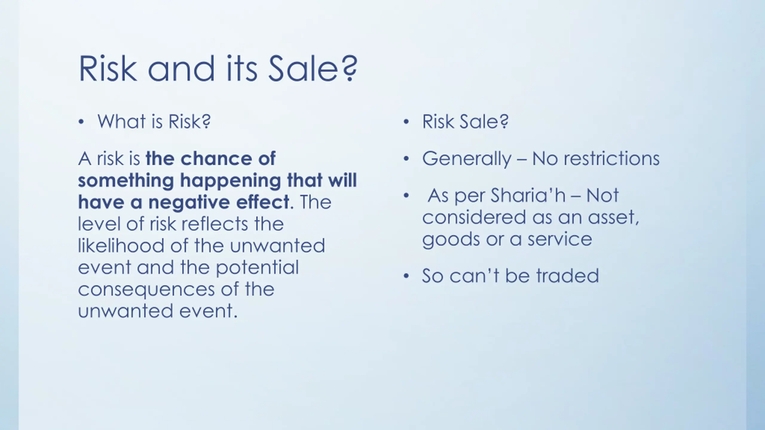 Risk and its Sale? What is Risk? Risk Sale? A risk is the chance of something happening that will have a negative effect. The level of risk reflects the likelihood of the unwanted event and the potential consequences of the unwanted event. Generally No restrictions As per Sharia h Not considered as an asset, goods or a service So can t be traded