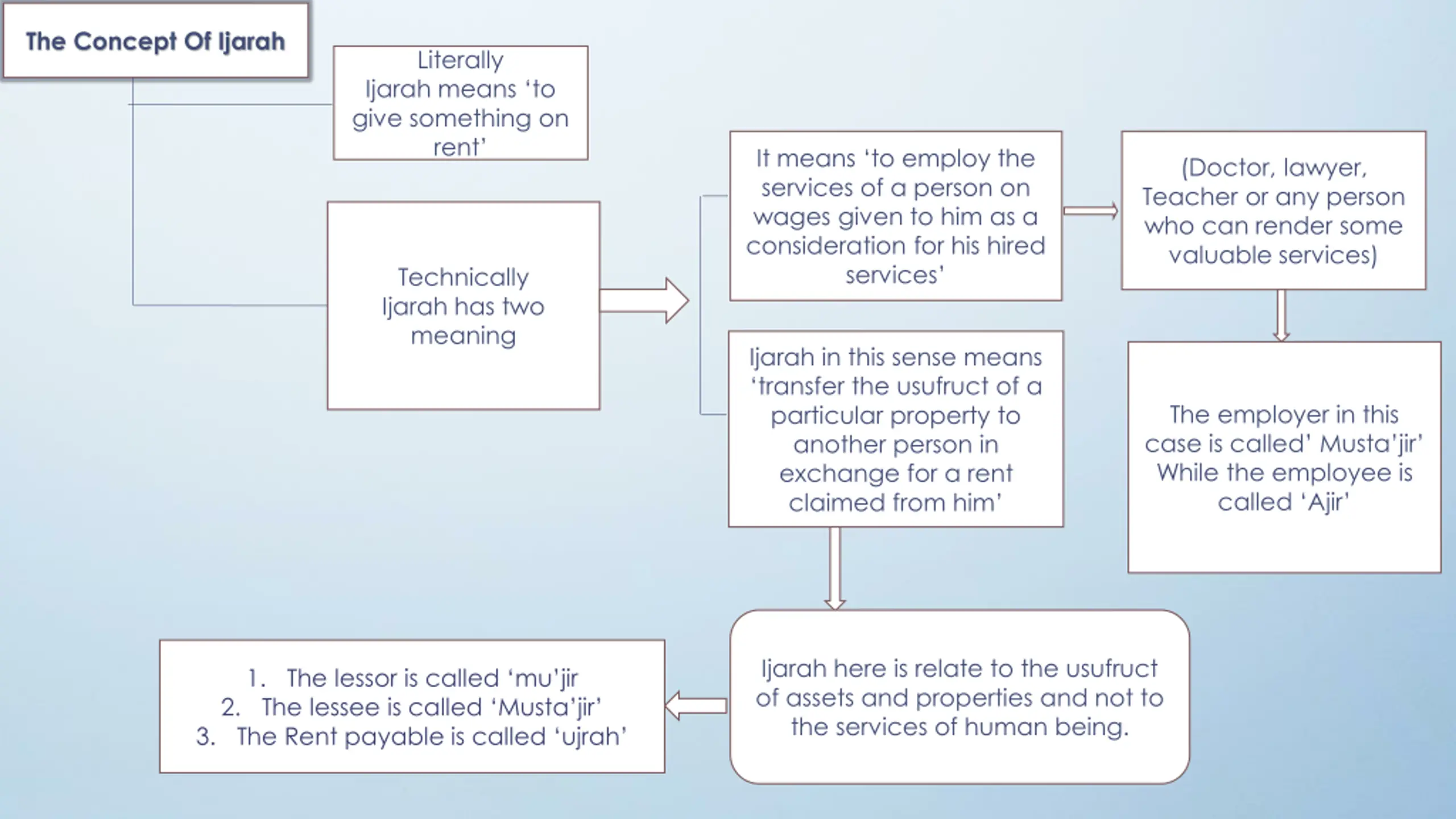 The Concept Of Ijarah Literally Ijarah means to give something on rent It means to employ the services of a person on wages given to him as a consideration for his hired services (Doctor, lawyer, Teacher or any person who can render some valuable services) Technically Ijarah has two meaning Ijarah in this sense means transfer the usufruct of a particular property to another person in exchange for a rent claimed from him The employer in this case is called Musta jir While the employee is called Ajir Ijarah here is relate to the usufruct of assets and properties and not to the services of human being. 1. The lessor is called mu jir 2. The lessee is called Musta jir 3. The Rent payable is called ujrah