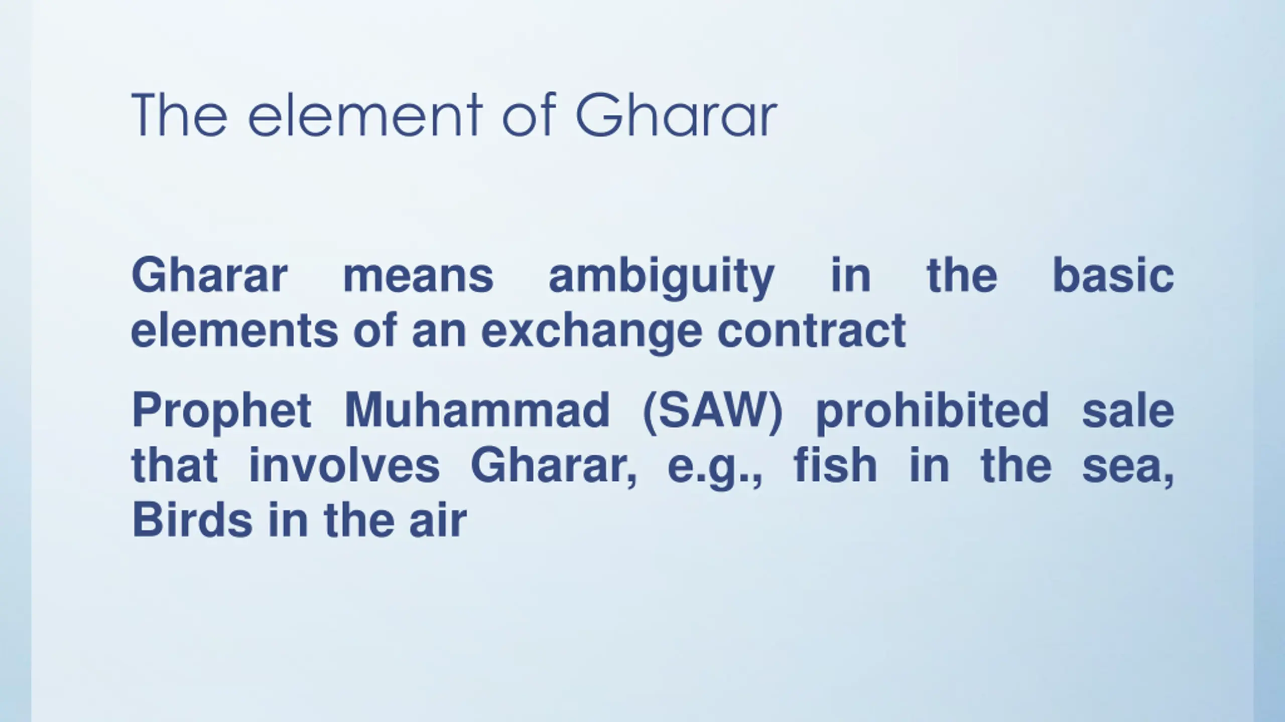 The element of Gharar Gharar means ambiguity in the basic elements of an exchange contract Prophet Muhammad (SAW) prohibited sale that involves Gharar, e.g., fish in the sea, Birds in the air